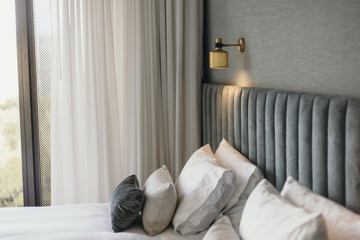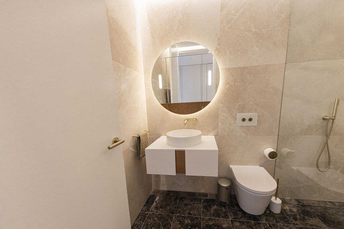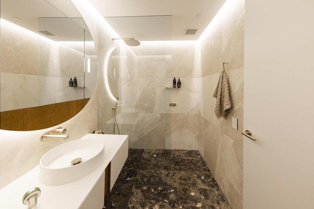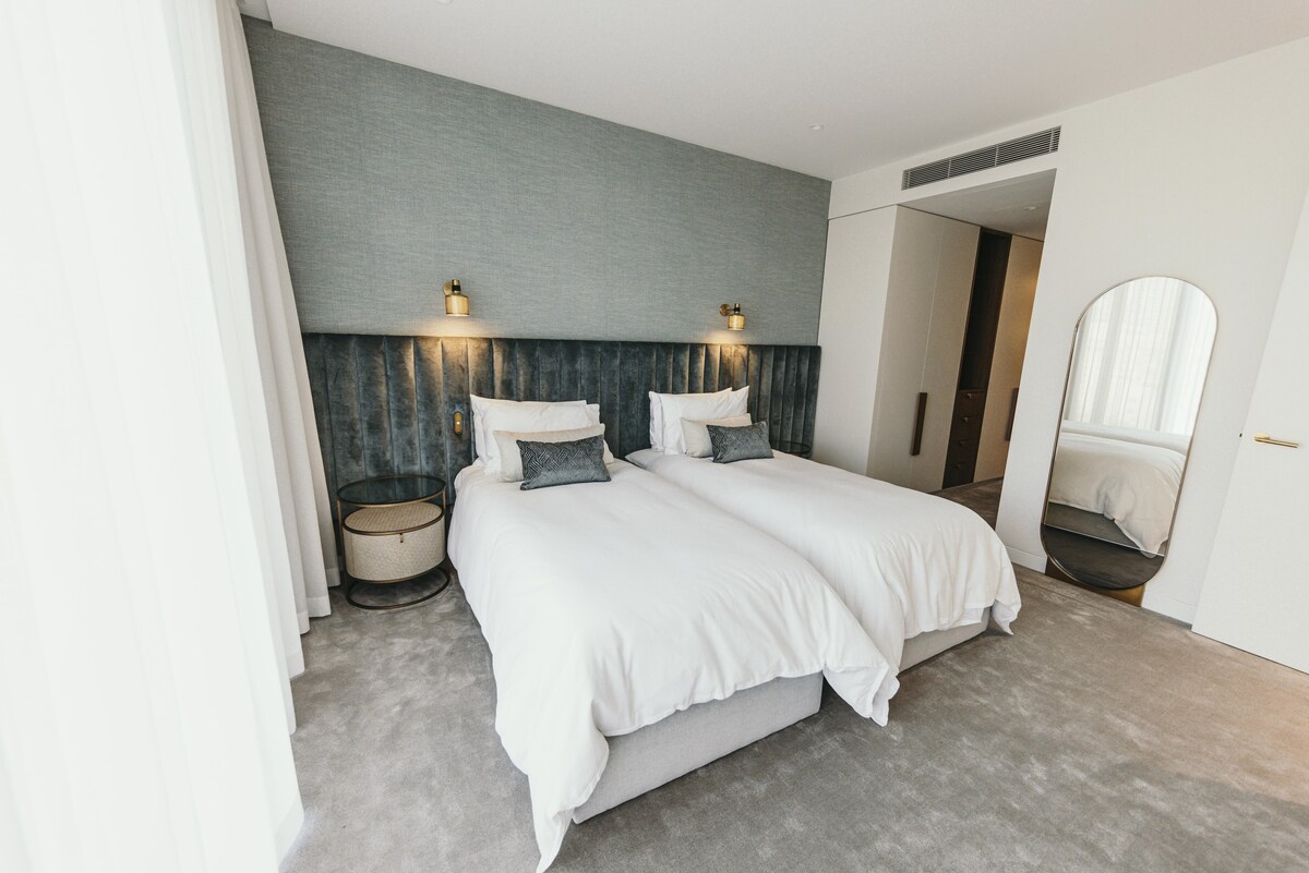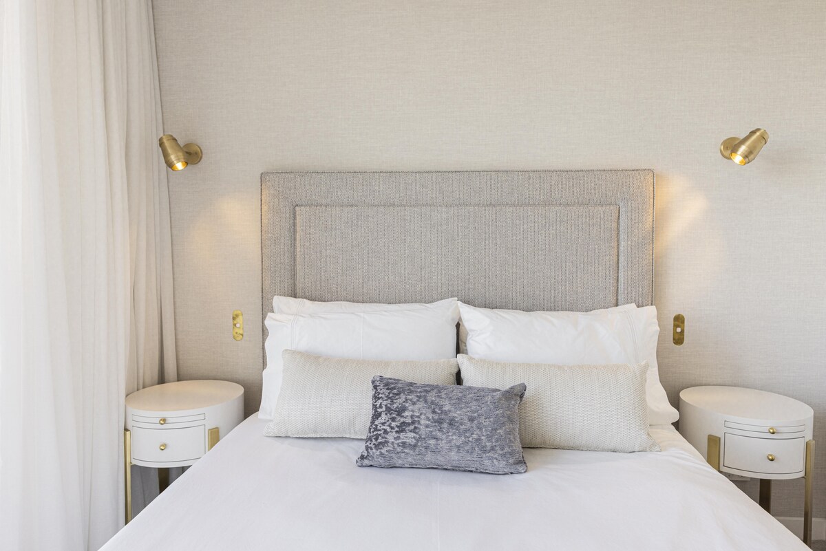 The two bedrooms ooze sophistication; a curvaceous teal velvet headboard draws your eye, in the master, complimenting the gold accents and oval mirror. The master bedroom has a King bed, while the second bedroom has a Queen offering you a spacious base to enjoy the view.