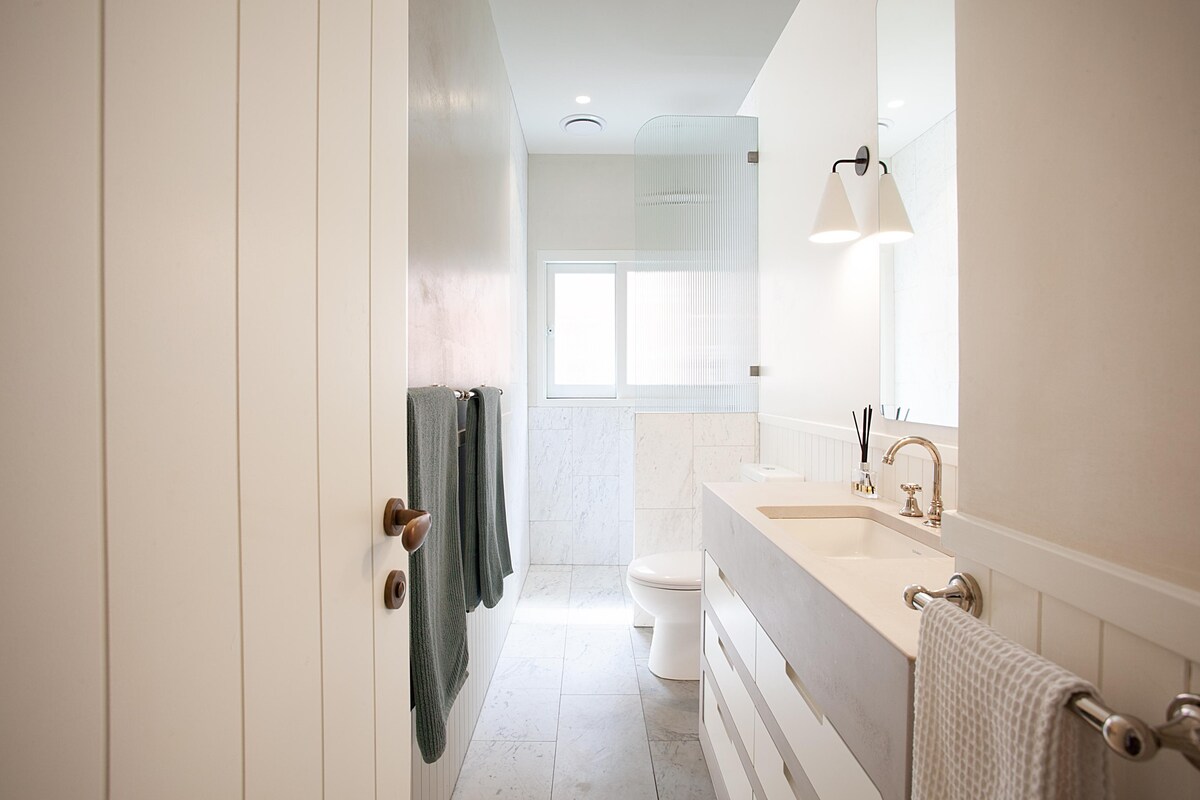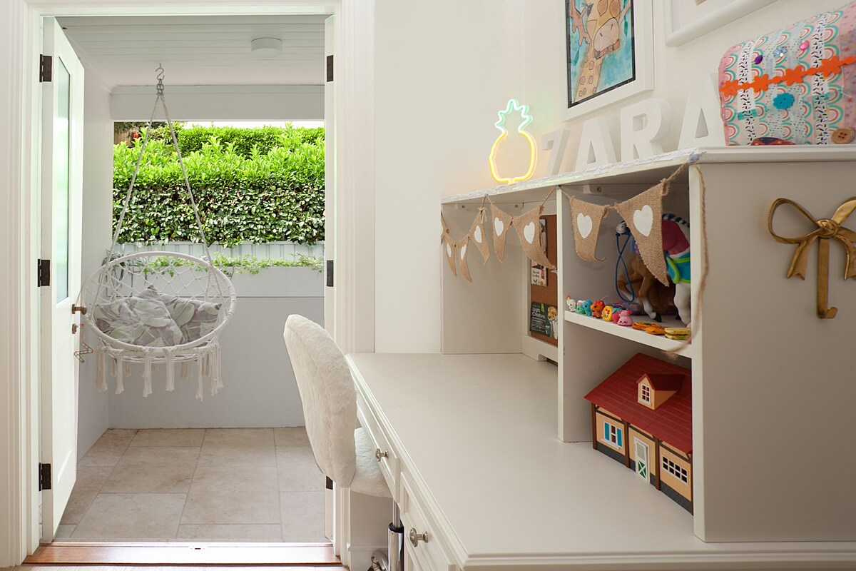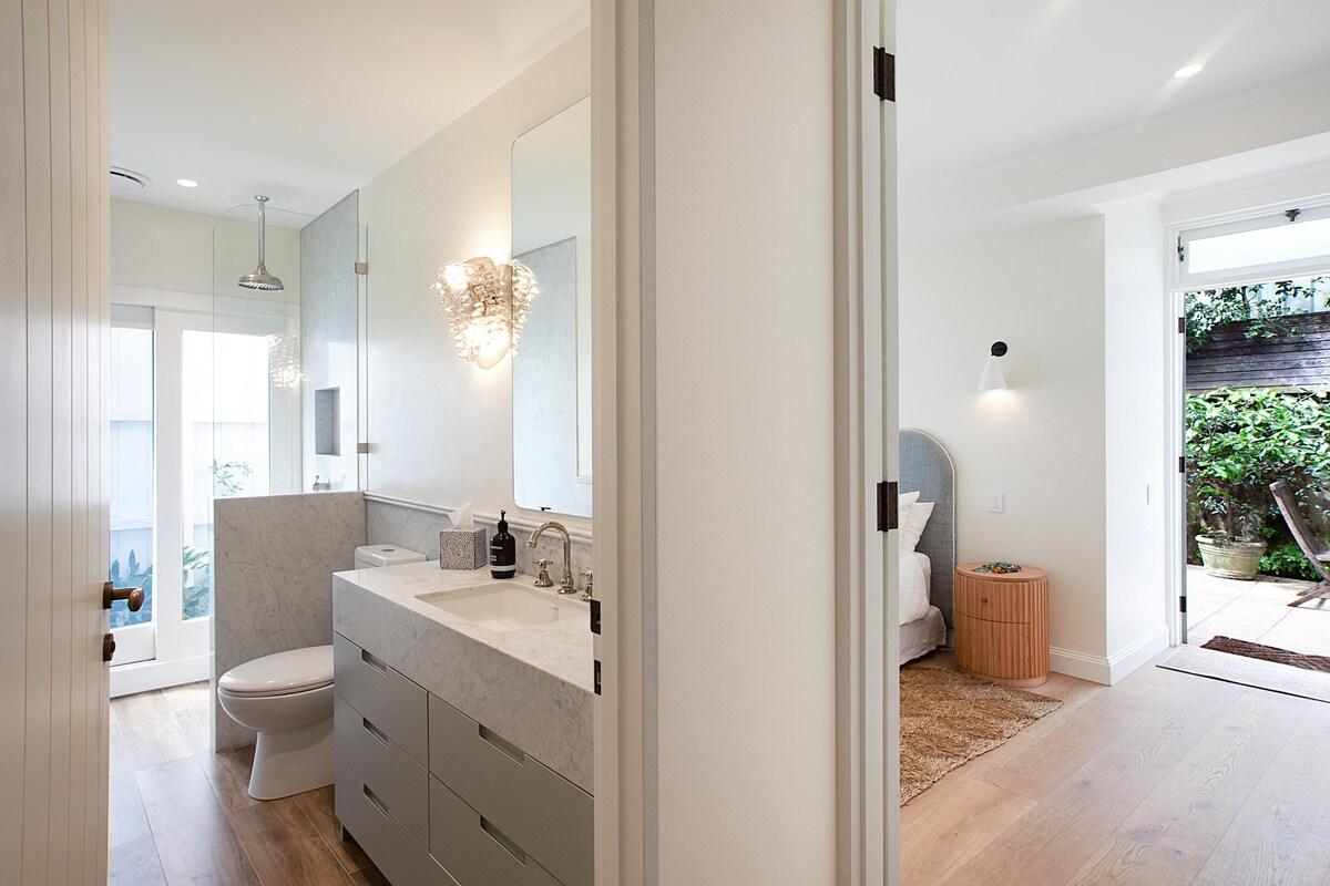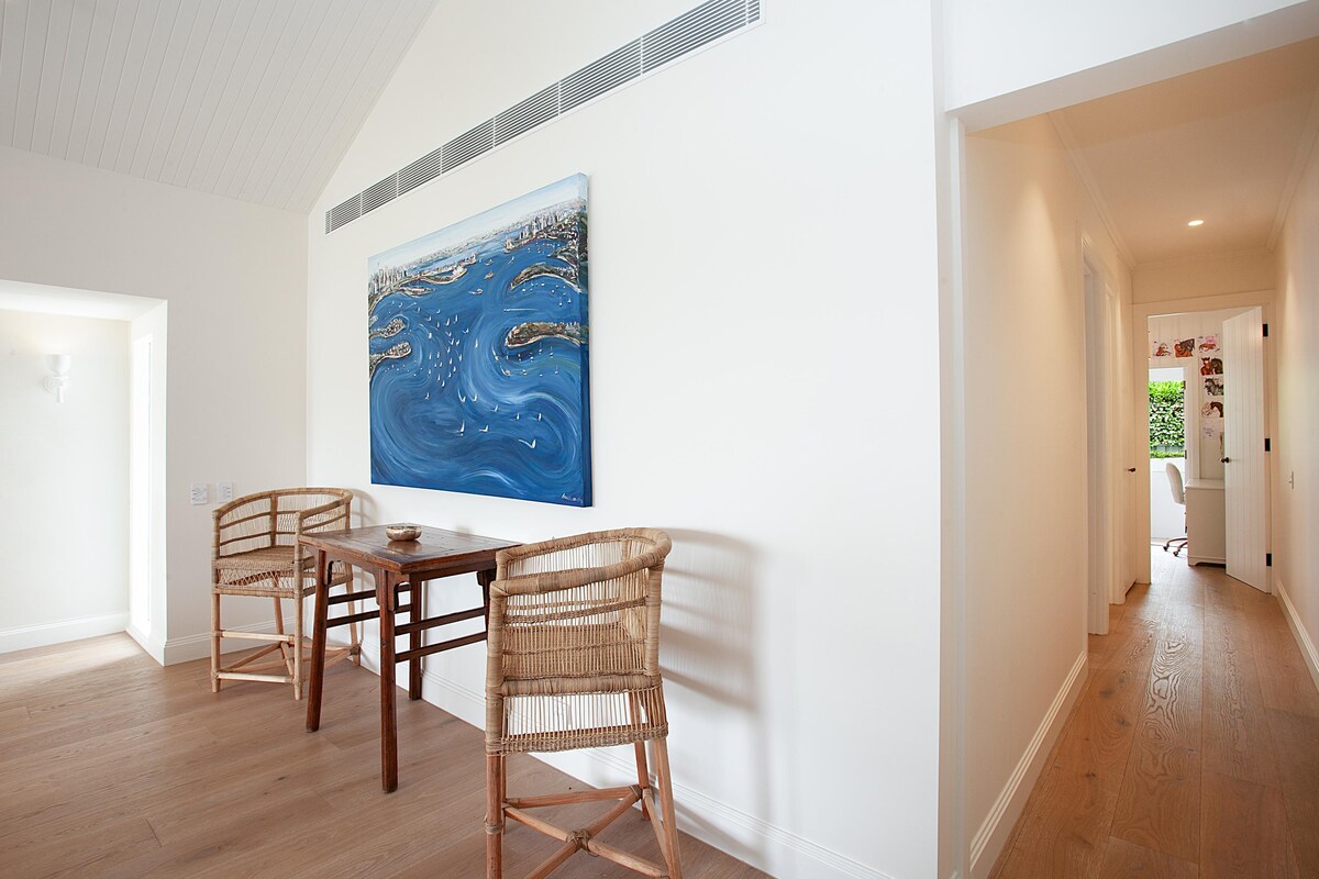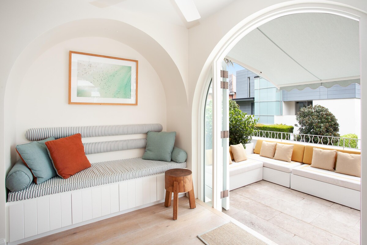 This home is a tale of two halves; on the ground floor, you'll discover a relaxed dining and lounge room, complete with serene coastal decor and a luxurious marble fireplace. The exquisite marble accents continue, spilling across the kitchen countertops, softened by the rattan chairs around the formal dining table. The ground floor is truly multi-purpose, with snug seating nooks and access to a private terrace, complete with a retractable awning to shield when needed from the summer sun. Conversely, the first floor boasts an entertaining space, dedicated to enjoying the famous Harbour Bridge views. Many an evening could be spent mixing tipples at your full cocktail bar and enjoying them from the accompanying sitting area.