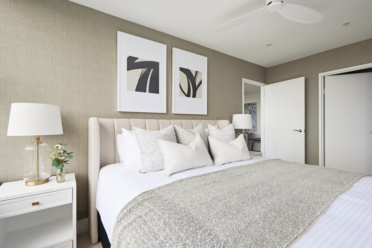 Tasteful modern art and a sumptuous King bed fill the bedroom with neutral glamour, for a relaxing stay.