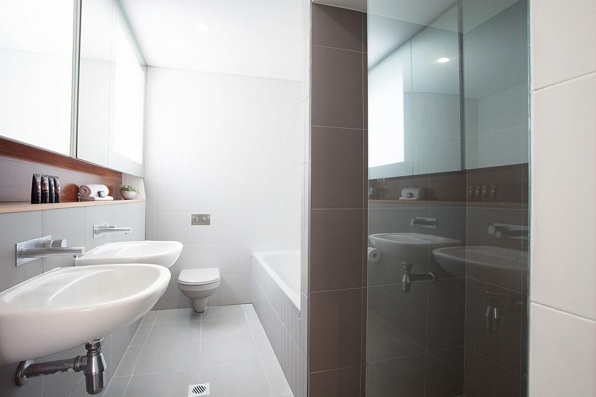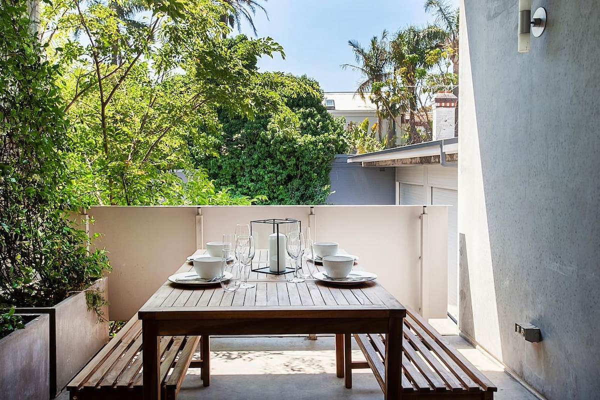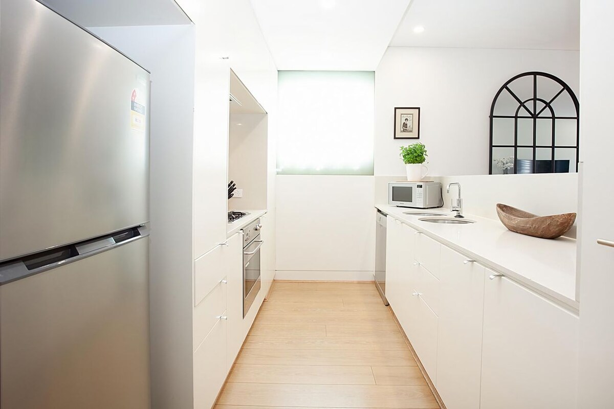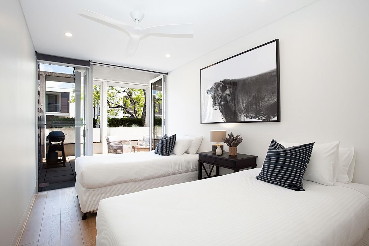 The designer kitchen comes well-equipped stone benchtops and high-quality stainless-steel appliances, including a Blanco gas cooktop and an integrated dishwasher. The master bedroom features a deluxe ensuite with a walk-in shower and separate bathtub. Both bedrooms feature built-in robes and are enclosed by floor-to-ceiling glass doors that extend seamlessly to a spacious garden courtyard.