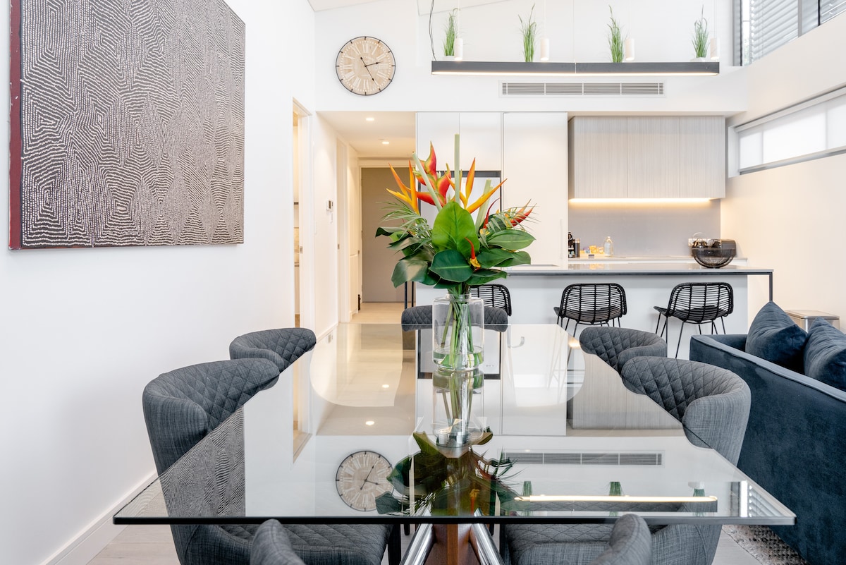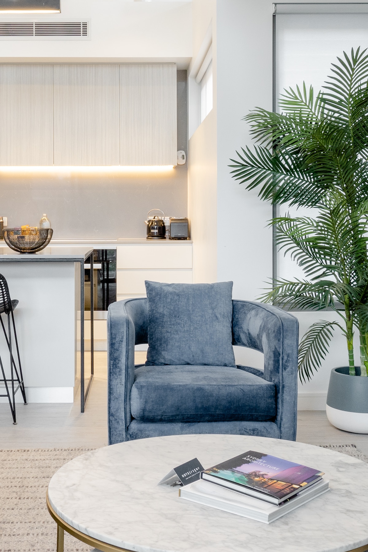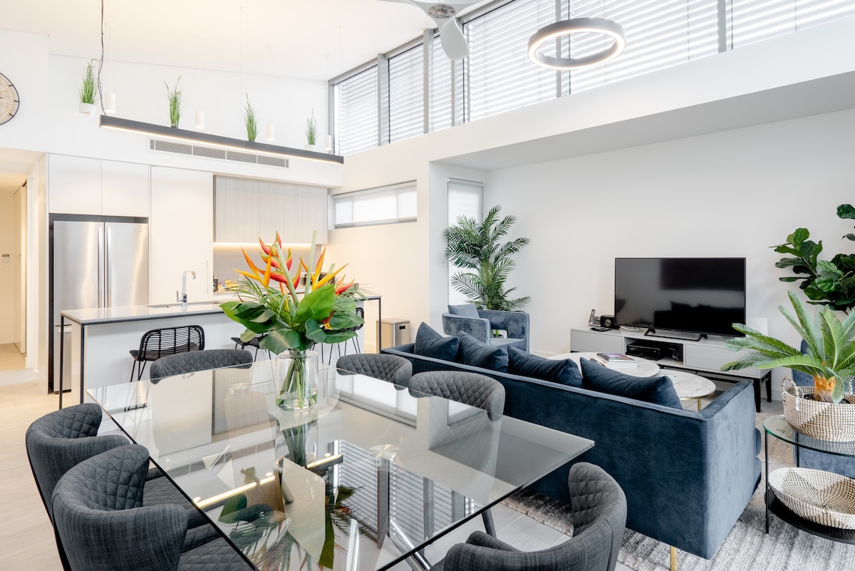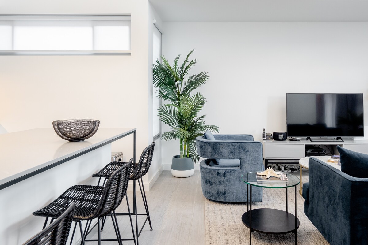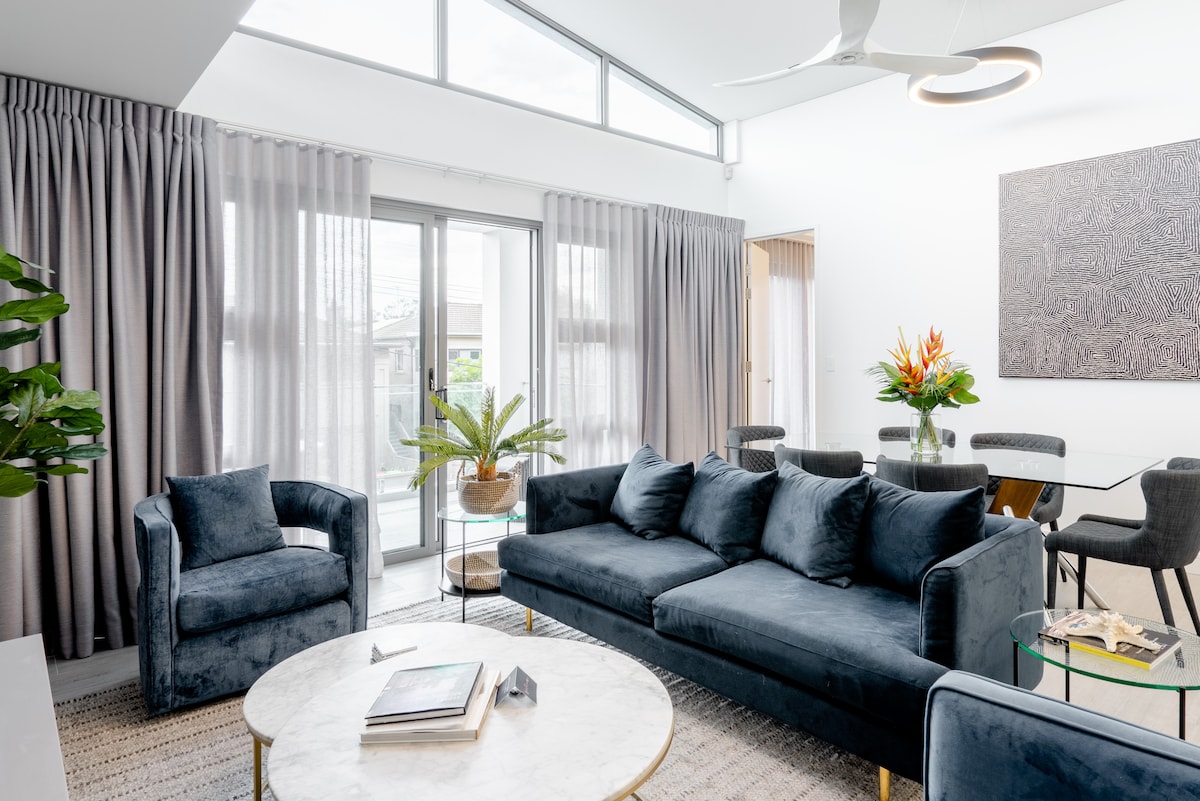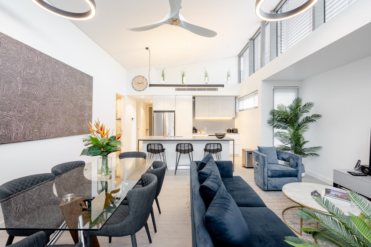 Soak up the natural light in the double-height, flowing living and dining space minutes from the idyllic shore. Plush slate-grey fabrics, contemporary geometric touches, and gleaming glass and polished stone make for a sumptuous coastal sanctuary.