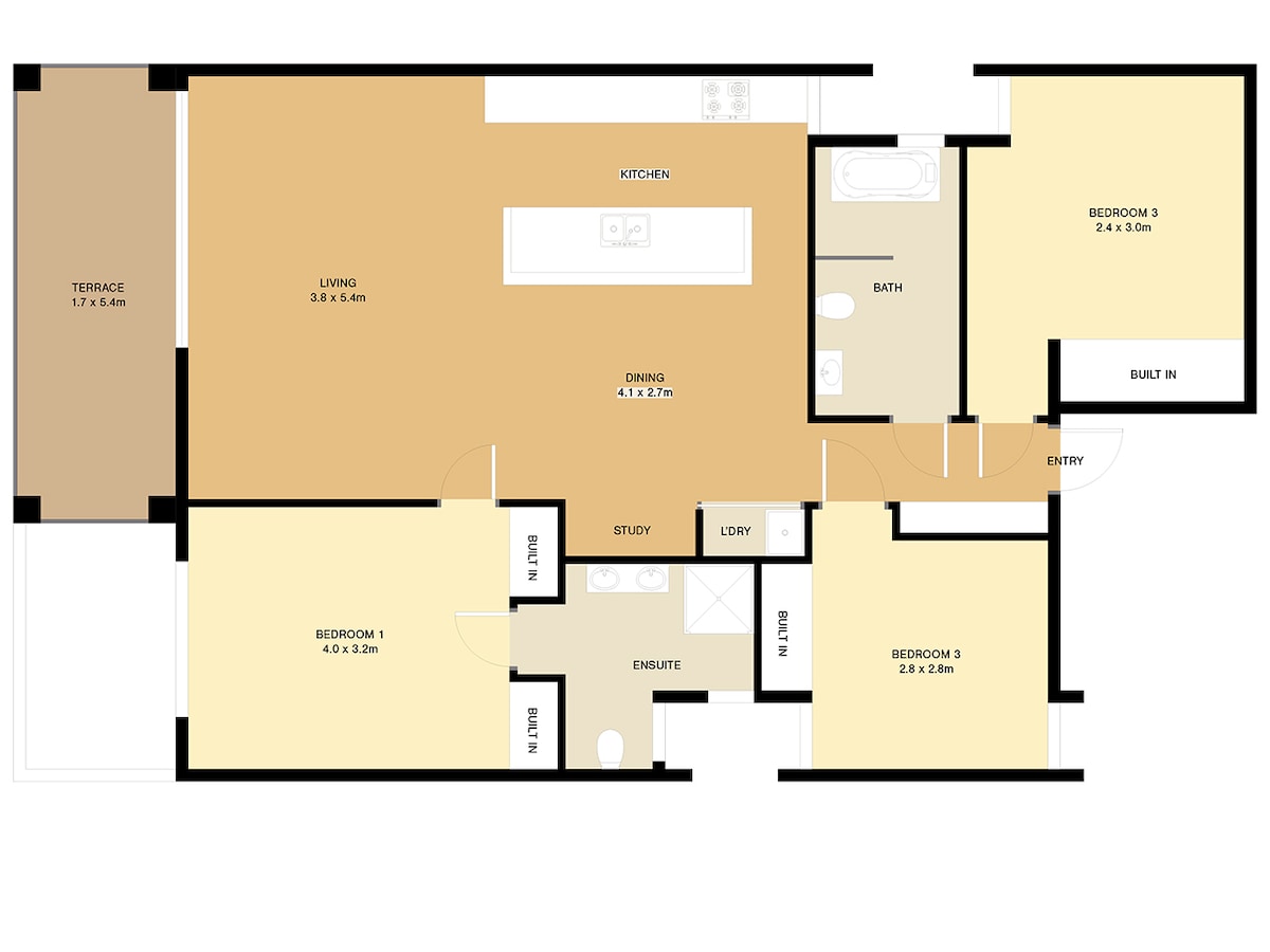 - Spacious open plan kitchen, dining, study and living area, -
