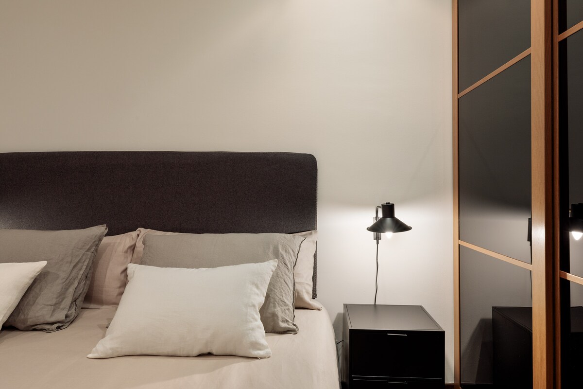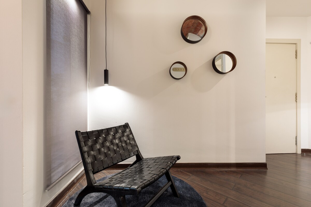 As you step inside, you'll be greeted by natural light illuminating the warm wooden floors, guiding you into a living area where simplicity meets comfort. The living room features a plush greywhite toned sofa that can be converted into a bed, providing a cozy space for relaxation or an extra sleeping area. The elegant wooden dining table with industrial black chairs offers a stylish spot for meals or work.The bedroom serves as your private sanctuary, equipped with a comfortable double bed dressed in fresh linens, ensuring a good night's sleep. The modern decor is consistent throughout, with clean lines and a soothing color scheme that enhances the tranquil atmosphere.