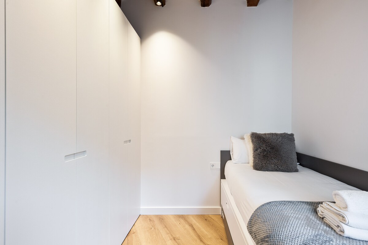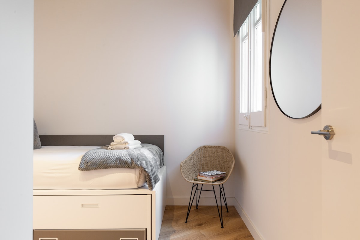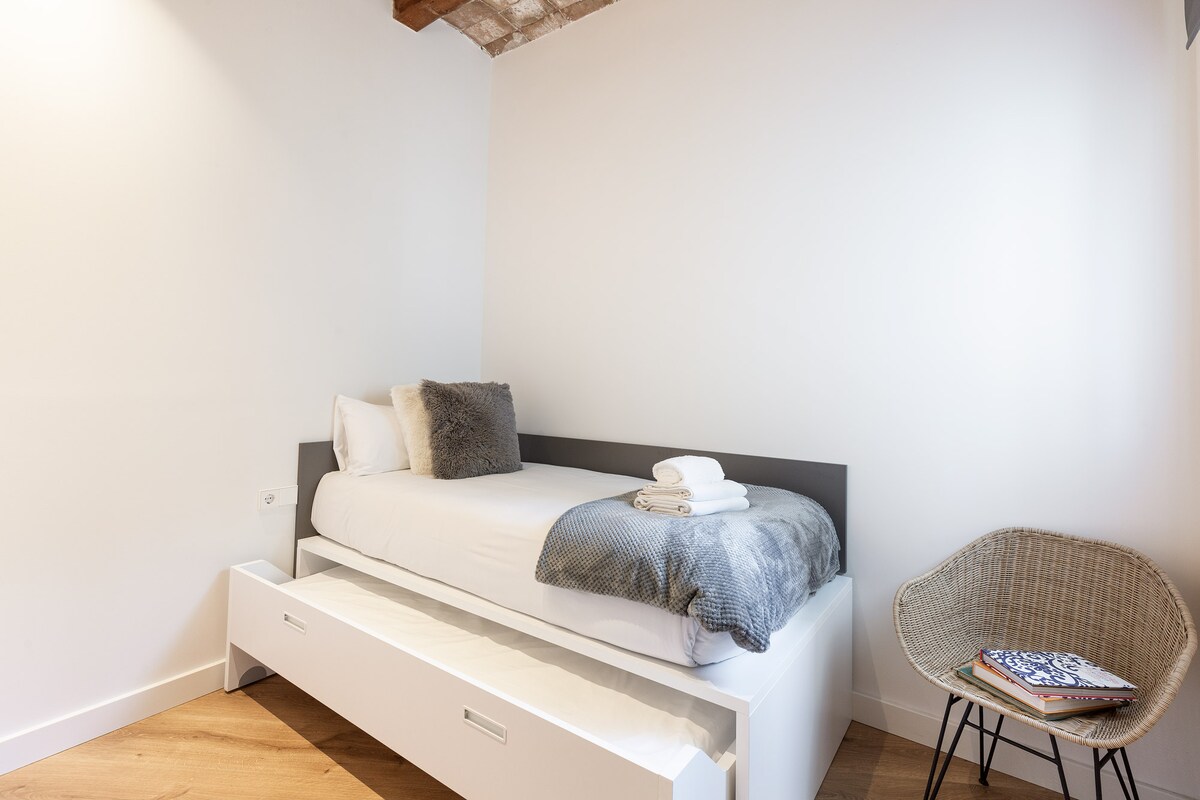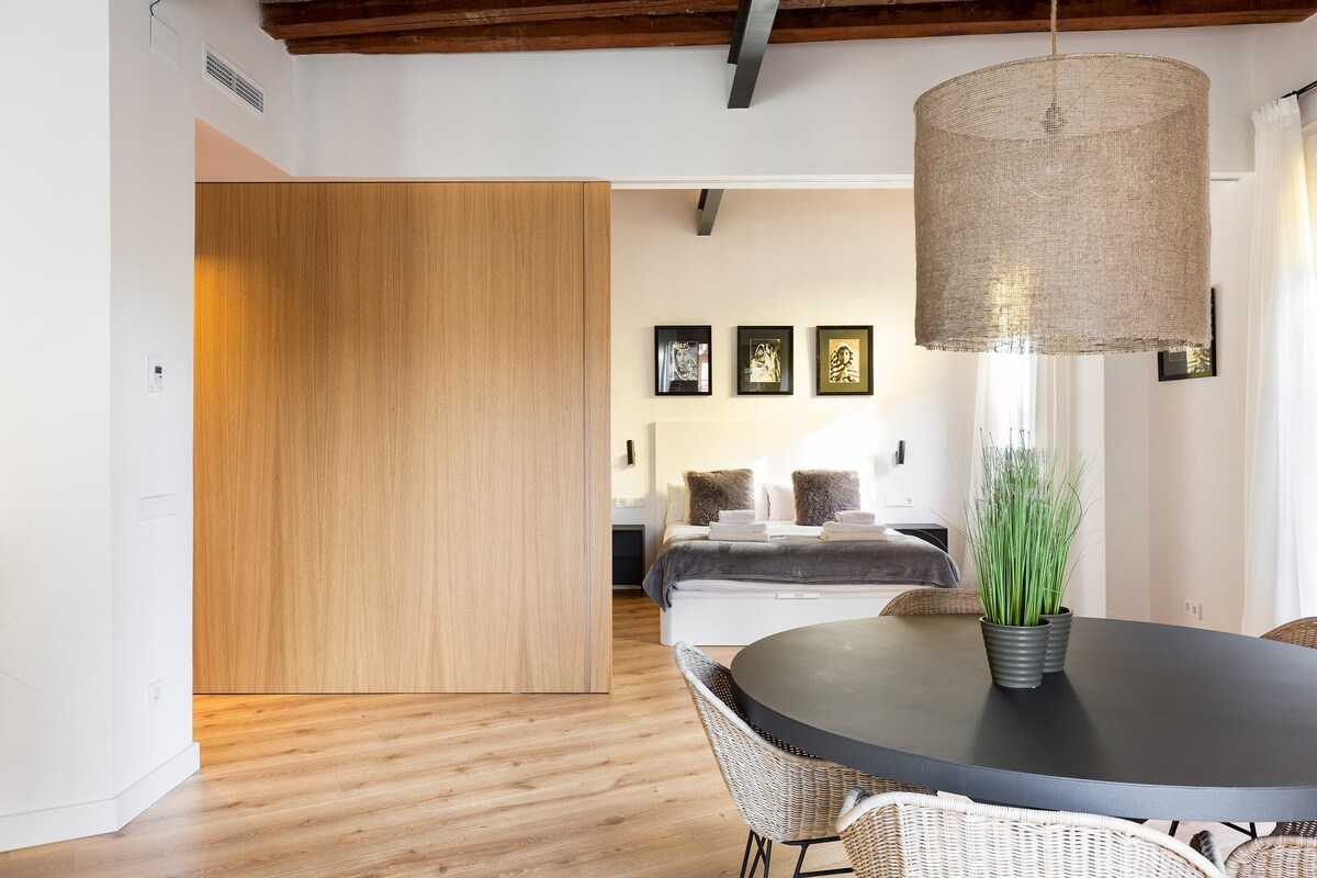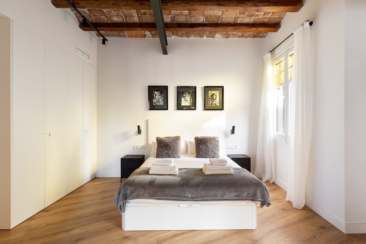 The living room’s main feature are the massive windows that let in plenty of natural light and give you views of the neighborhood below. A big TV and a big sofa in the corner also make this space a great place to relax after a day in Barcelona. There is also a big dining table on the other side of the living room. A modern touch, the big wooden sliding doors, separates or opens the space up for you to find the master bedroom with a double bed. The bigger bathroom is privately connected to this room. The ceilings are designed with exposed bricks, this is classic in Barcelona.