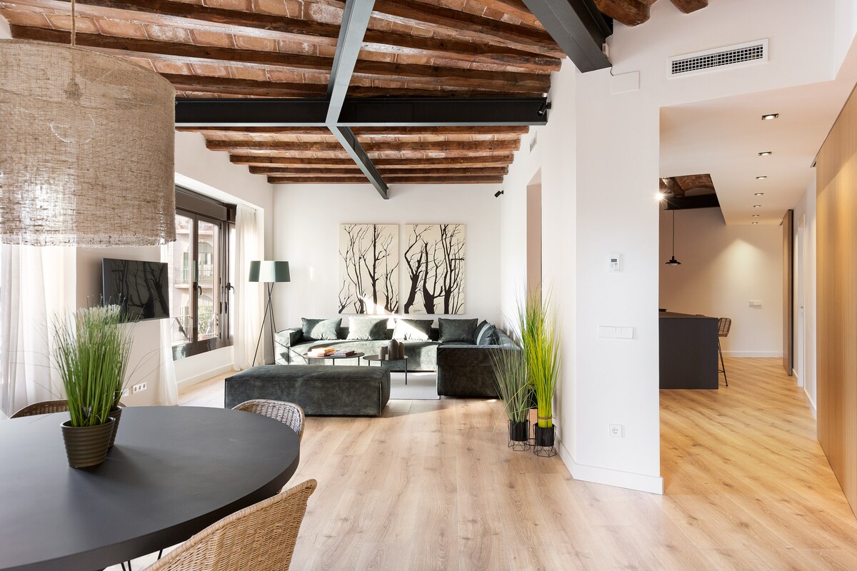 # Important note: all legal and licensed apartments in Barcelona are obliged to pay a tourist tax, which is excluded of the prices.When you enter the apartment, you will be amazed by the immediate open floor plan and natural light. Immediately to your right, you will find a fully renovated kitchen with high end features. Just past that are the two bedrooms on the left that flow into the living room.