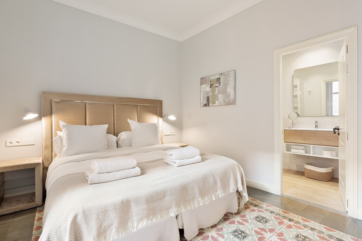 Discover spacious luxury and tasteful décor within our centrally located retreat. The apartment is bathed in natural light, courtesy of expansive French doors in the living room and master bedroom. It features two generously sized bedrooms: the master suite boasts a king-size bed (180cm), convertible into twin beds upon request, and an ensuite with a spacious walk-in shower. The second bedroom offers a queen-size bed (160cm), also adaptable to twin beds, and access to a large walk-in shower. The living room serves as a comfortable hub for relaxation and dining, with a convertible sofa bed to accommodate additional guests, and opens onto a quaint balcony, mirroring the master suite.Amenities include a state-of-the-art 65" smart TV, high-speed fiber optic WiFi with 1GB bandwidth perfect for remote working, and central air conditioning/heating to ensure an ideal climate year-round. The apartment also features a fully equipped kitchen, washing machine, dishwasher, cable TV, a charming terrace, and welcomes pets. Linens, towels, and an array of modern conveniences are provided to ensure your stay is as comfortable as possible.