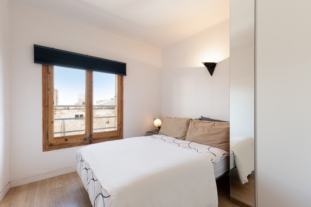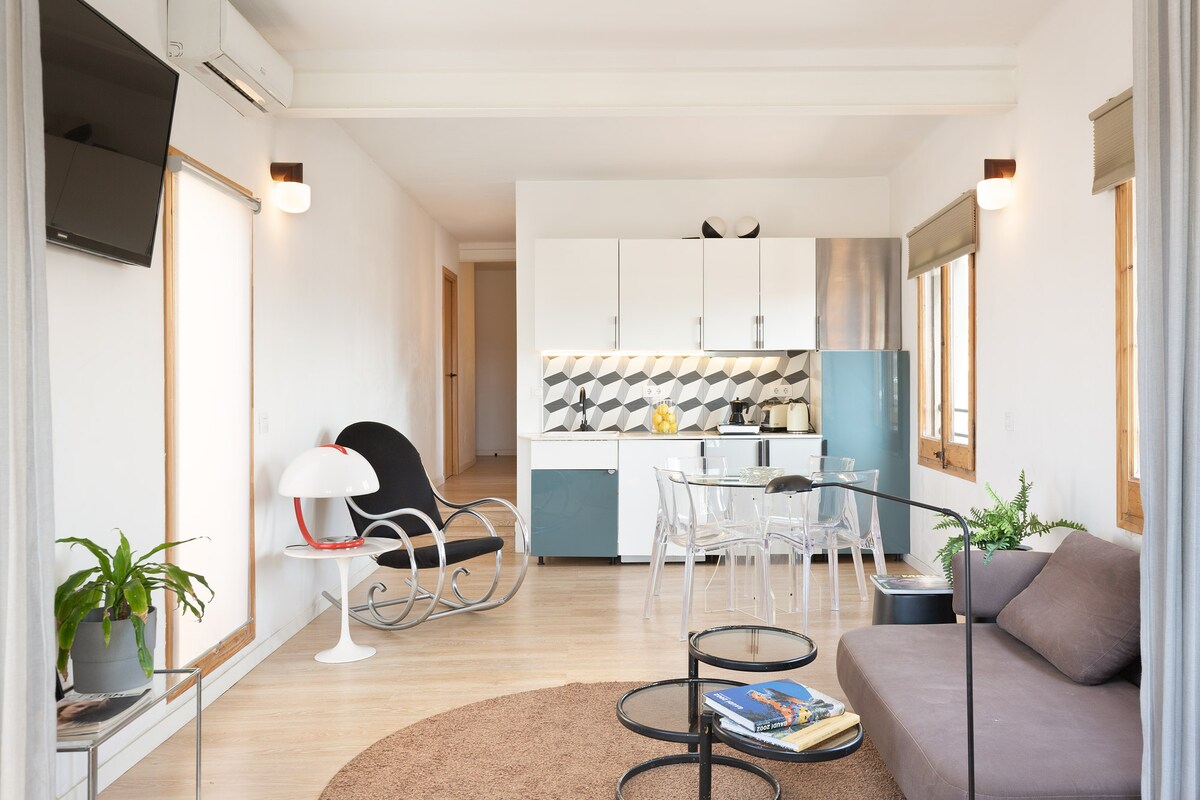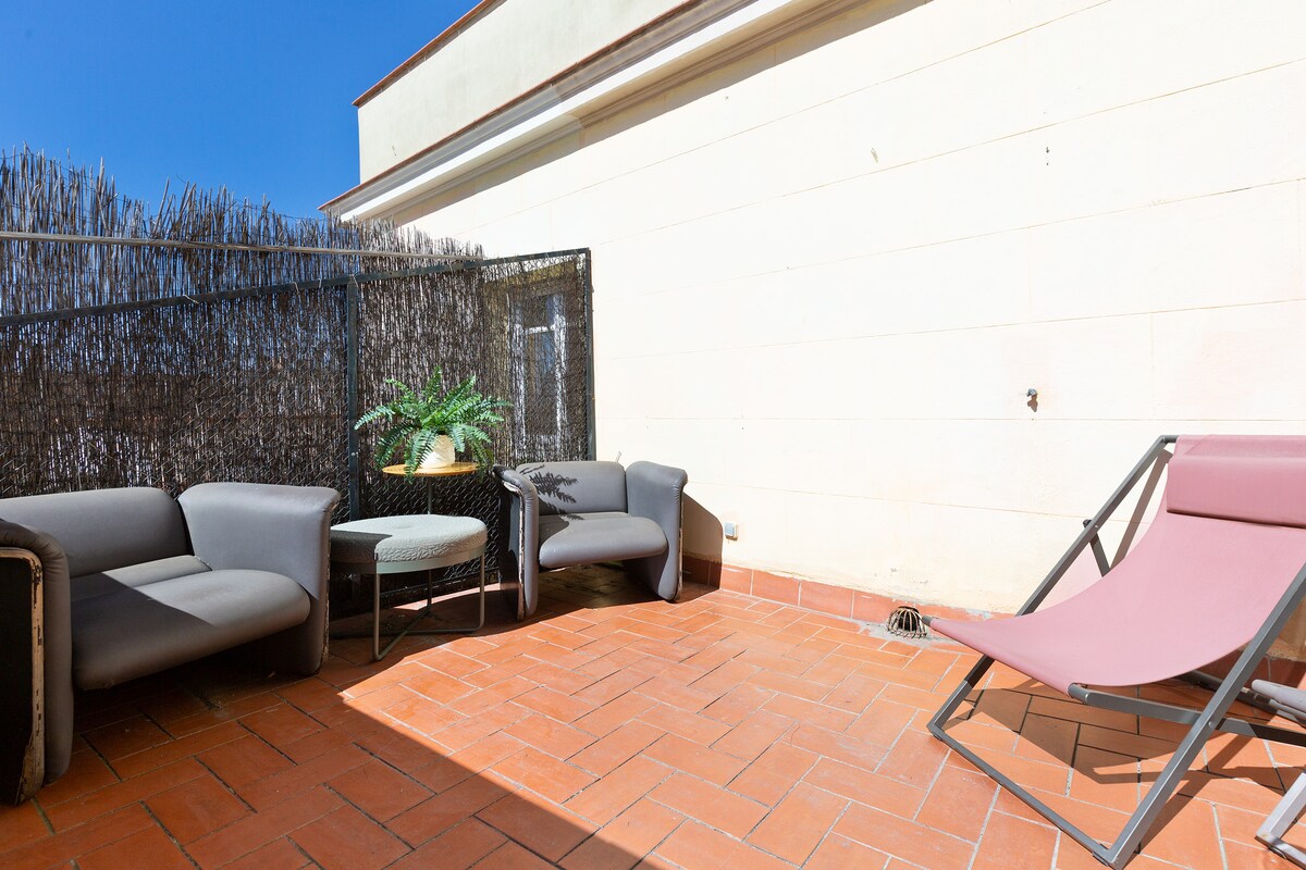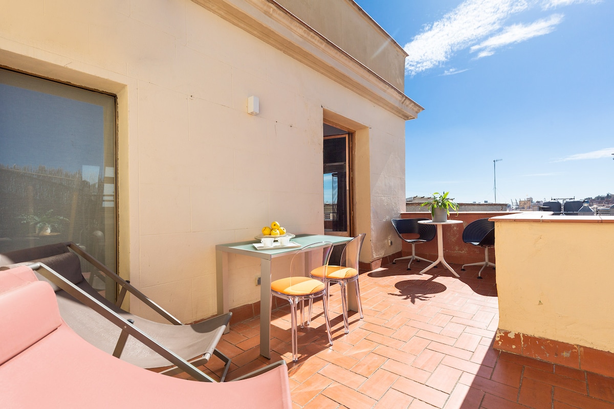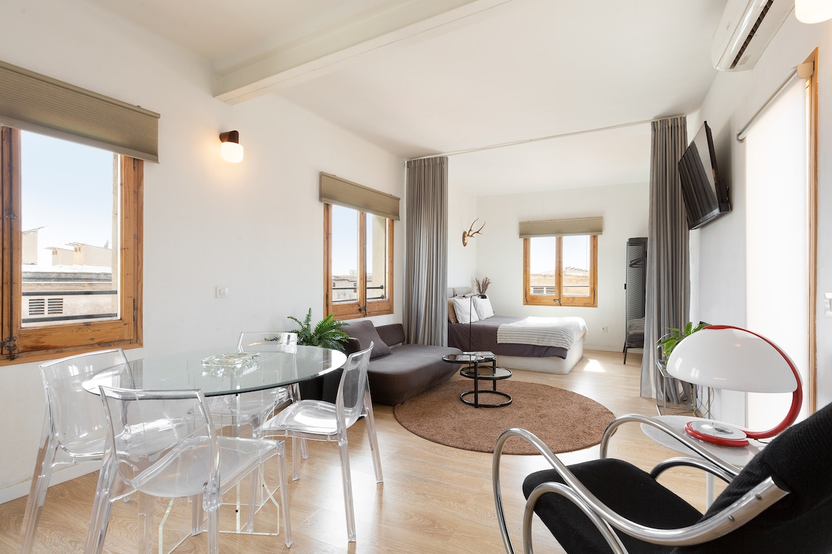 Beautiful apartment at the top floor (with a lift) in an historical building at the heart of the Gothic quarter. Recently renovated and furnished with a focus on design and quality. Has a big lounge area where is a well equipped open kitchen, dining table with chairs and the salon, who includes a sofa bed. The main bedroom is there too and can be closed or open to the lounge. Sunny all day thanks to a triple orientation, the apartment is quiet, with no traffic noises.