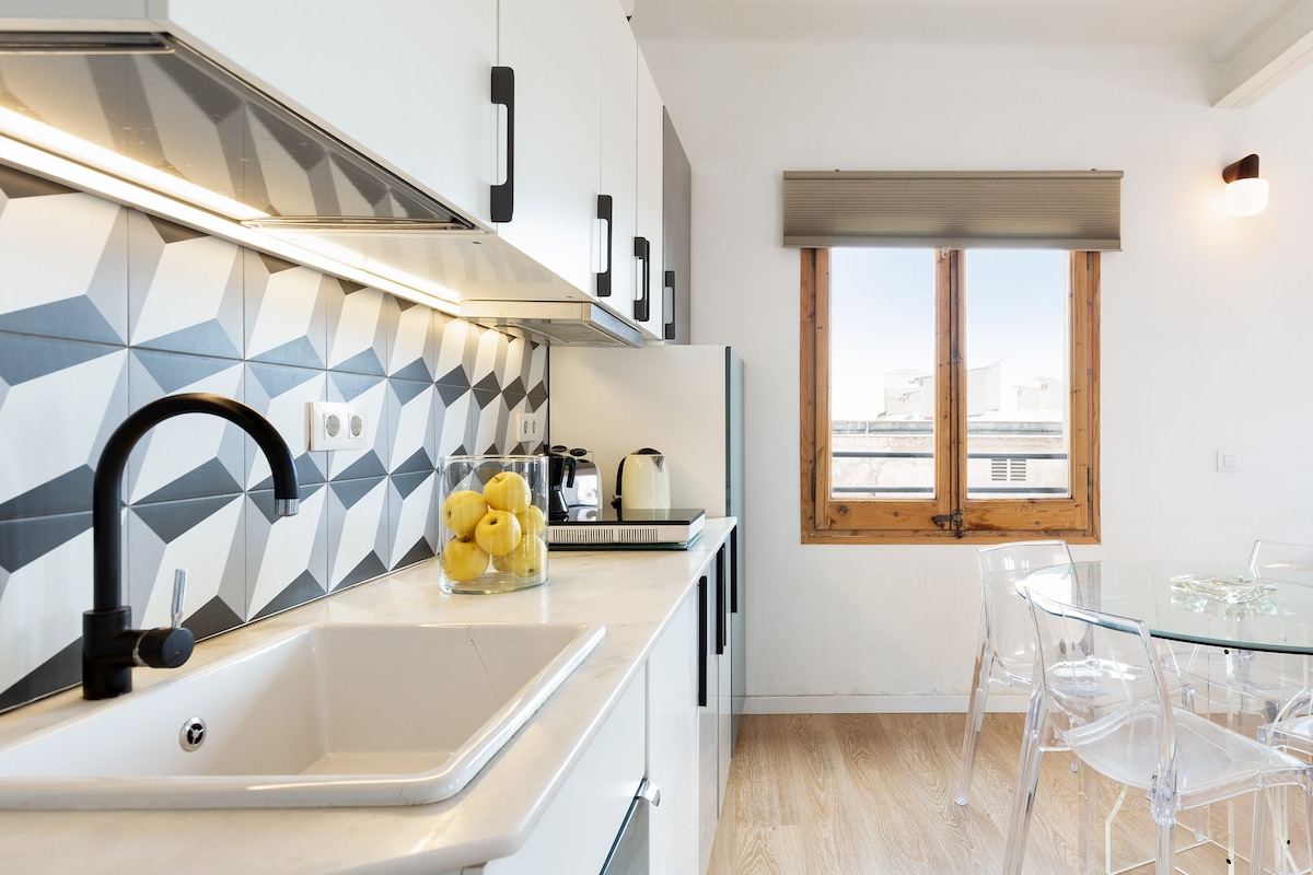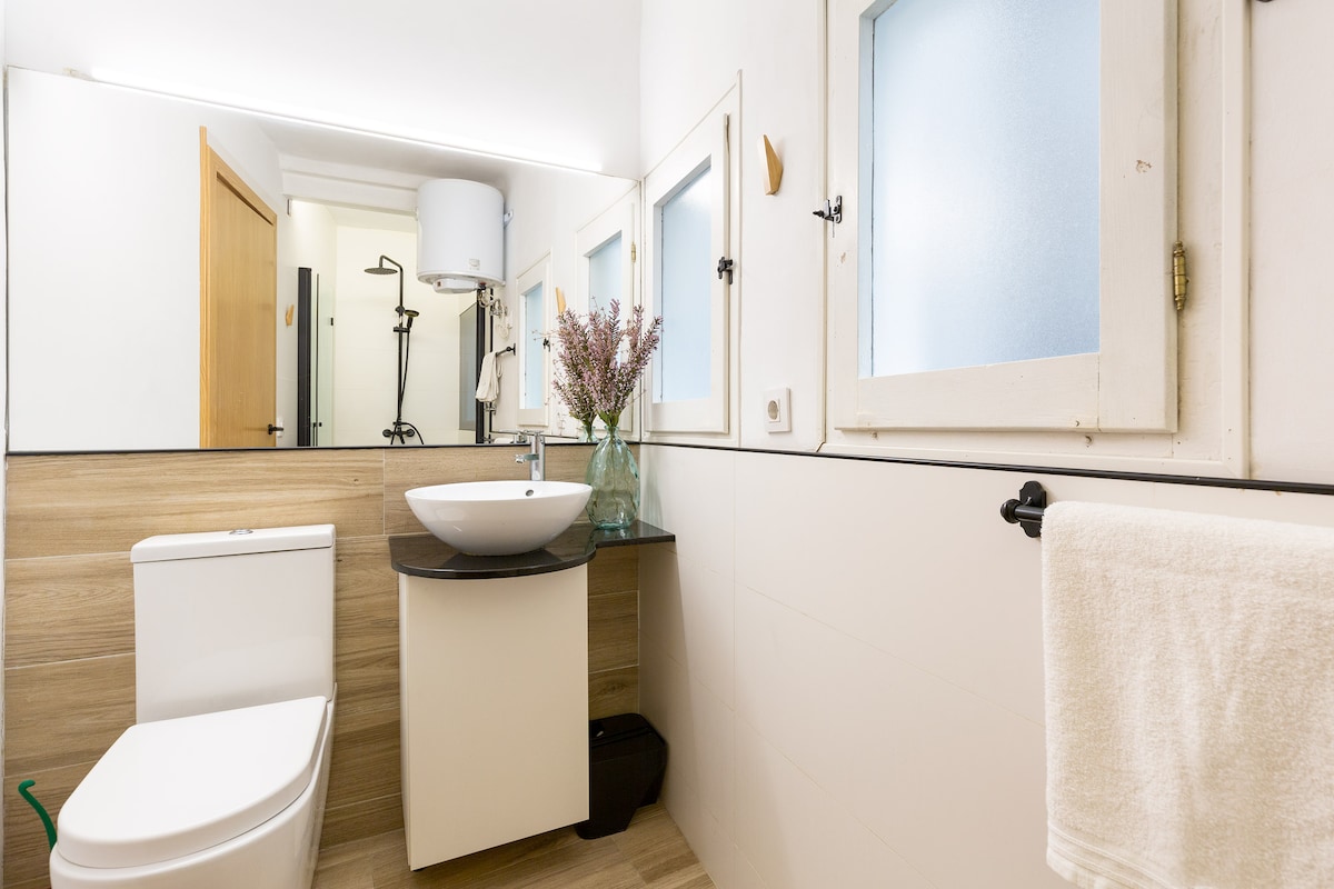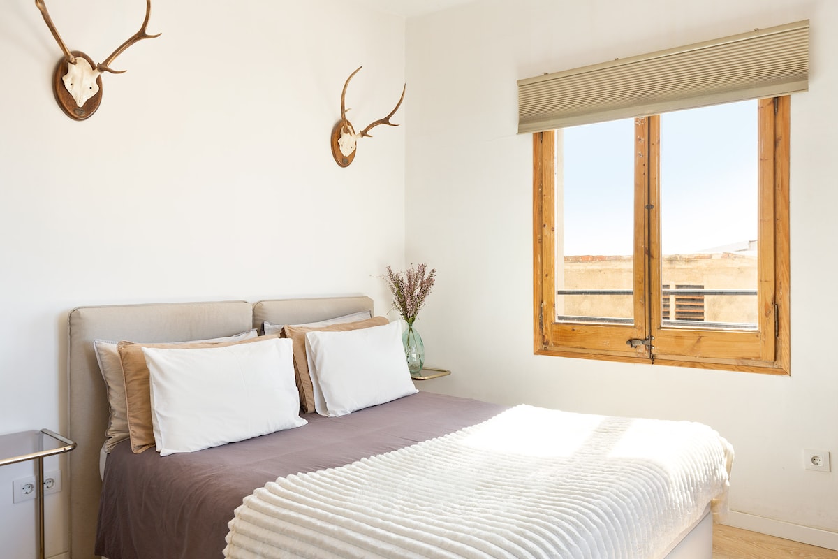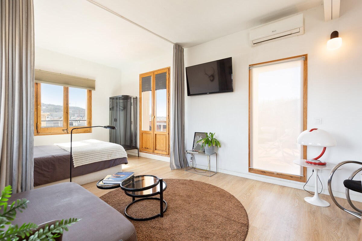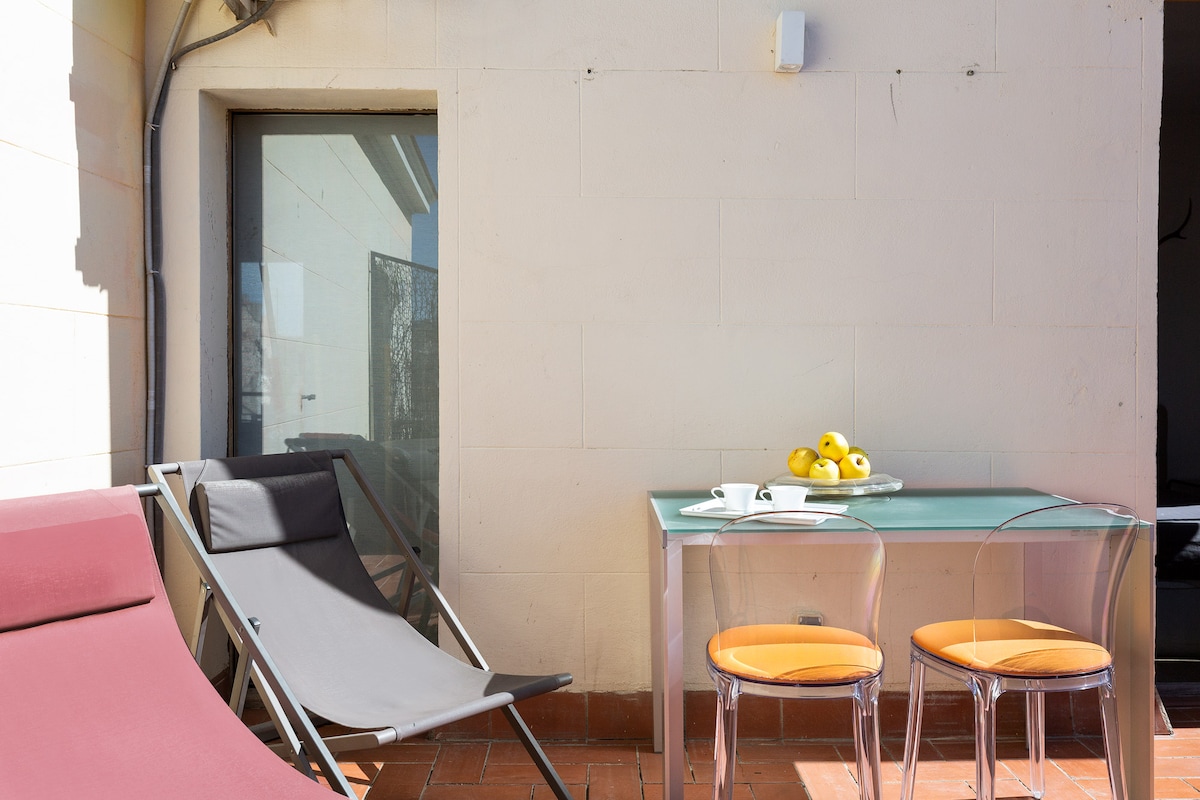 Beautiful apartment at the top floor (with a lift) in an historical building at the heart of the Gothic quarter. Recently renovated and furnished with a focus on design and quality. Has a big lounge area where is a well equipped open kitchen, dining table with chairs and the salon, who includes a sofa bed. The main bedroom is there too and can be closed or open to the lounge. Sunny all day thanks to a triple orientation, the apartment is quiet, with no traffic noises.