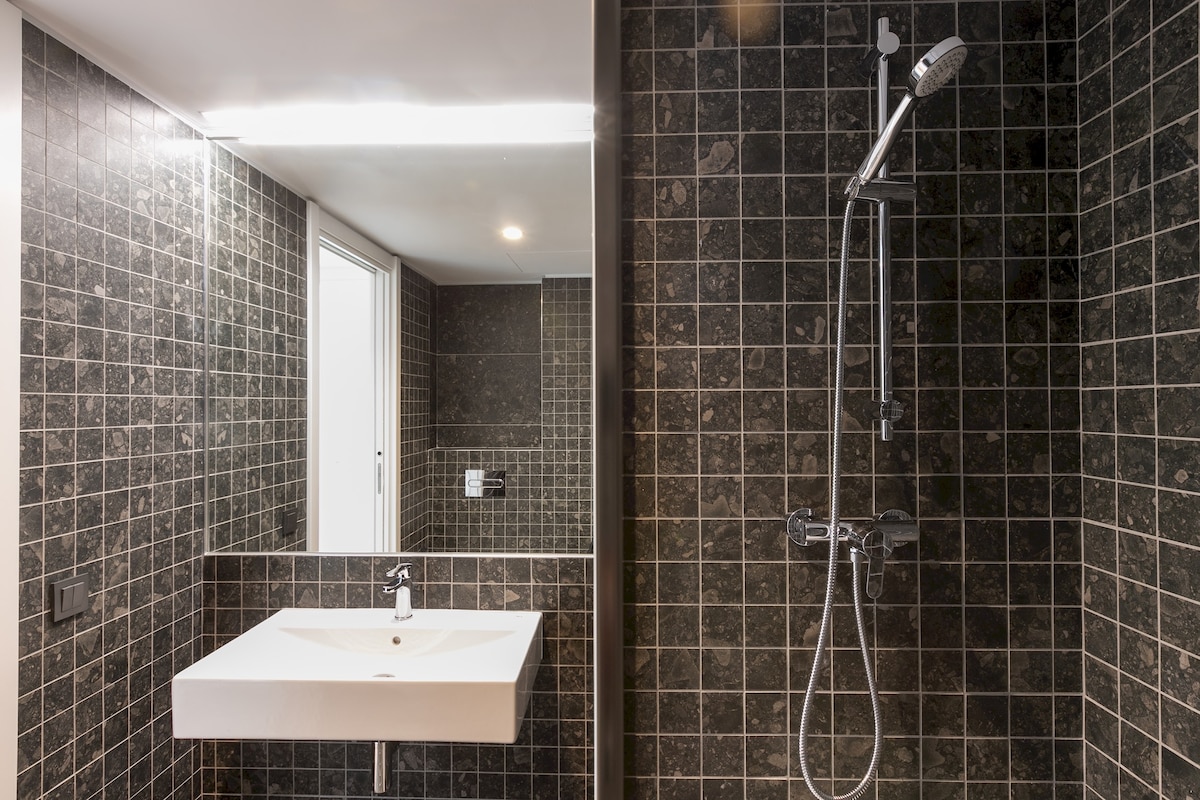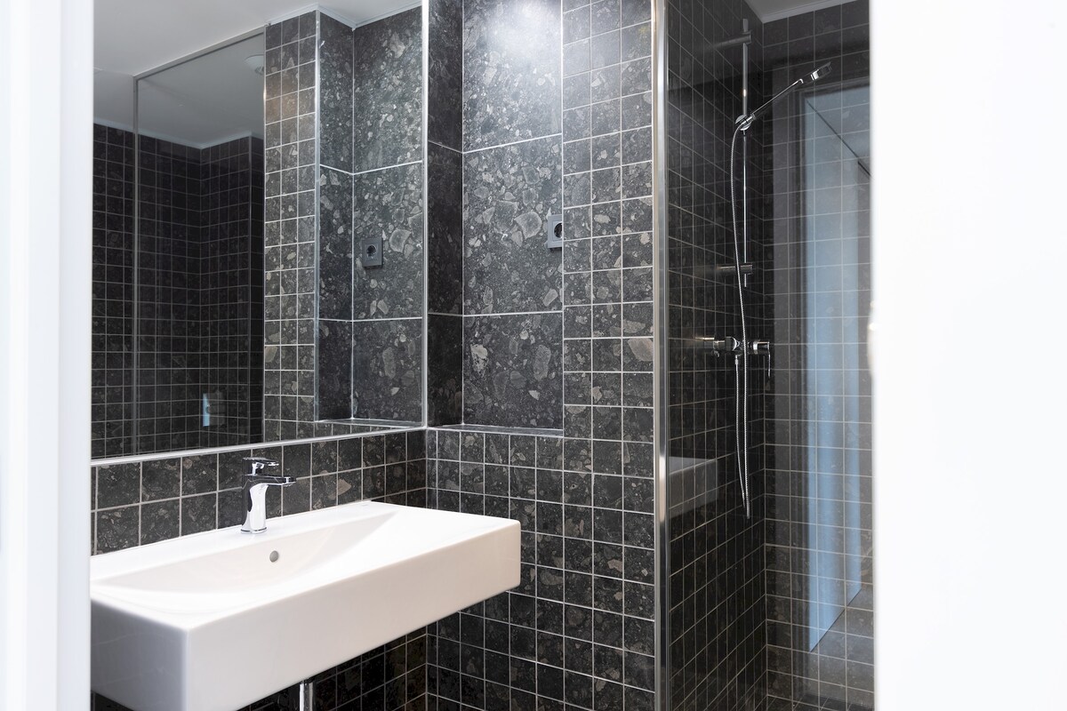 This apartment features two comfortable bedrooms, each with large windows that create a bright and serene ambiance. The bathroom is modern and elegant, equipped with high-quality amenities and a refreshing shower.