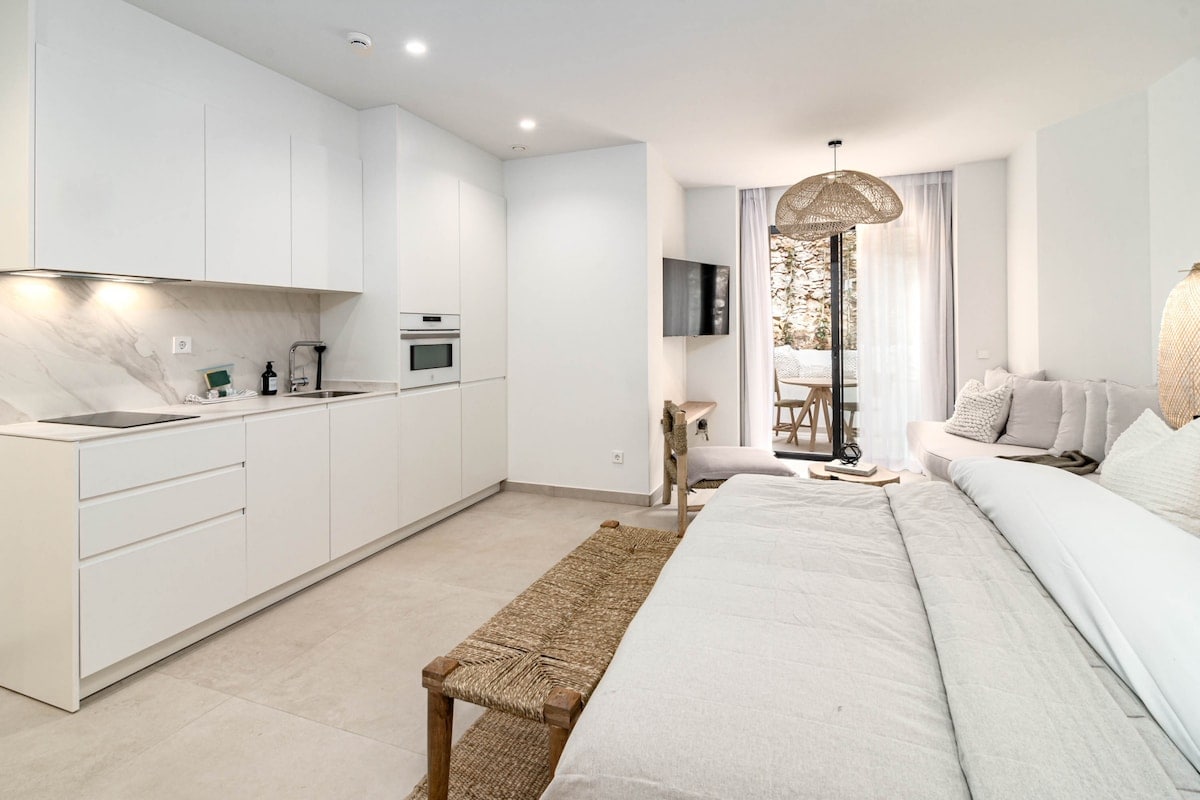 The studio is available for short-term rental, from 1 day up to 45 days, for 2 people or families. We offer additional services such as daily housekeeping and concierge service. It is designed in a contemporary and "chill" style using warm and soft fabrics authentic to the area, offering a bright and clean space.The fully fitted kitchen is equipped with kettle, toaster, coffee maker, fridge, dishwasher, built-in electric oven, a hob and microwave. The studio is equipped with washing machine, Tv, an iron and ironing board supplied for your convenience, cutlery, dishes and cleaning products.