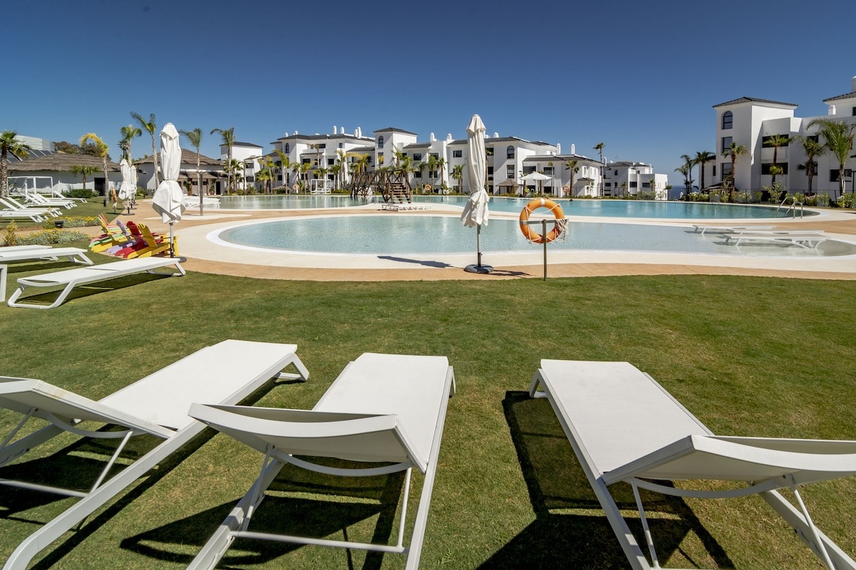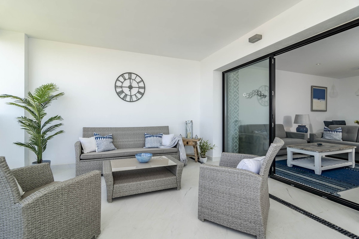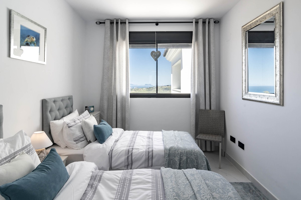 The 120 m² apartment has 3 bedrooms and 3 bathrooms and sleeps 6 people. It has a large 30 m² fully-furnished, south-facing balcony with spectacular views of the sea, Estepona Town, Gibraltar, and North Africa. The apartment is tastefully furnished and has Wi-Fi, Smart TV, Bose Bluetooth music system, air-conditioning, safe, iron, and hairdryer. The building has a lift and a dedicated indoor parking space. The apartment comes with a fully-fitted independent kitchen with refrigerator, freezer, microwave, induction hob, dishwasher, washing machine/dryer, Nespresso coffee machine, toaster, kettle, dishes/cutlery, and kitchen utensils.Guests have the use of two large swimming pools set in attractive grounds that are open year-round, with sun loungers and day beds, and an on-site cafe/cocktail/snack bar. Guests can also use the extensive facilities of Los Reales Sports Club, which is based at the resort, including a state-of-the-art gymnasium with free fitness classes and saunas, and tennis and padel courts (fee payable).