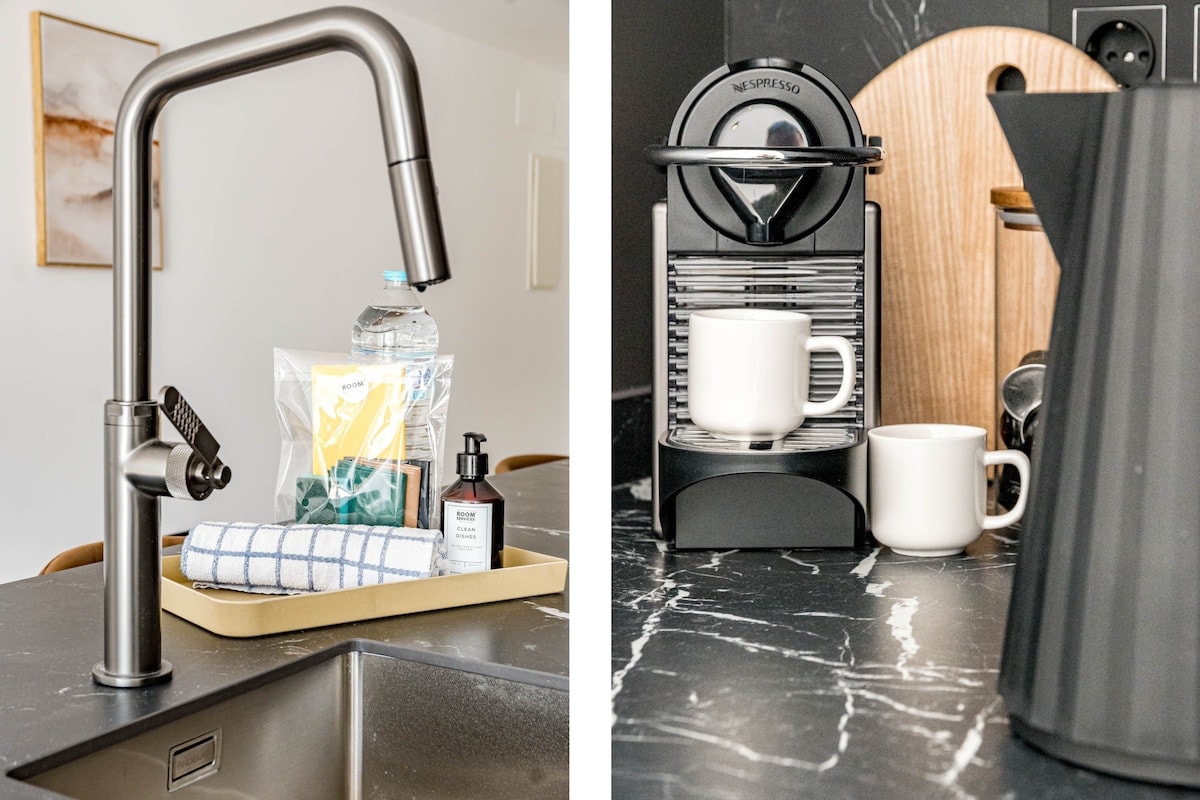 The open-plan kitchen, of induction, is equipped with a refrigerator, microwave, oven, freezer, dishwasher, dishes/cutlery, kitchen utensils, coffee machine, toaster, and kettle.