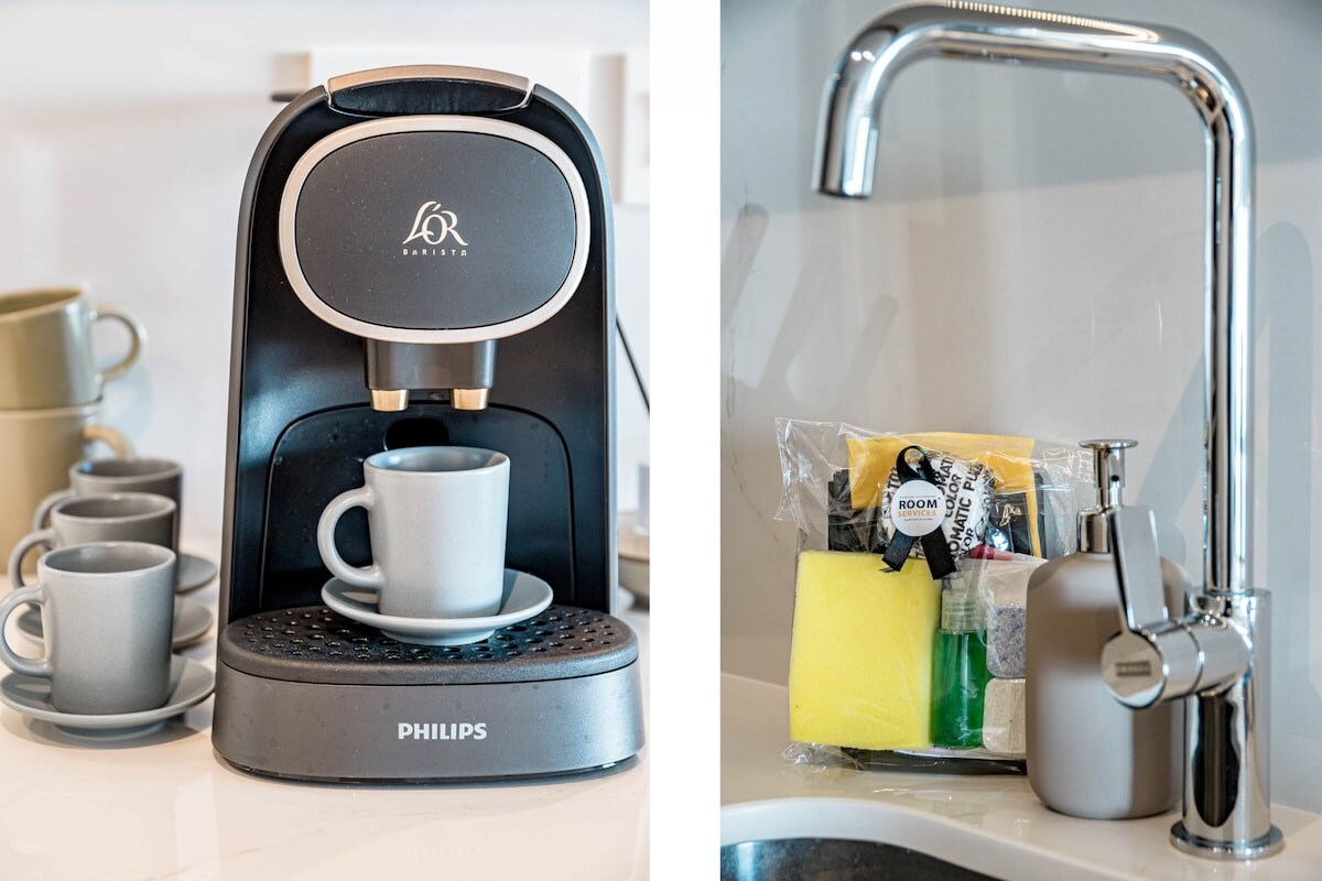 In the electric open-plan kitchen, you will find a refrigerator, microwave, oven, freezer, washing machine, dryer, dishwasher, dishes/cutlery, kitchen utensils, coffee machine, and juicer.
