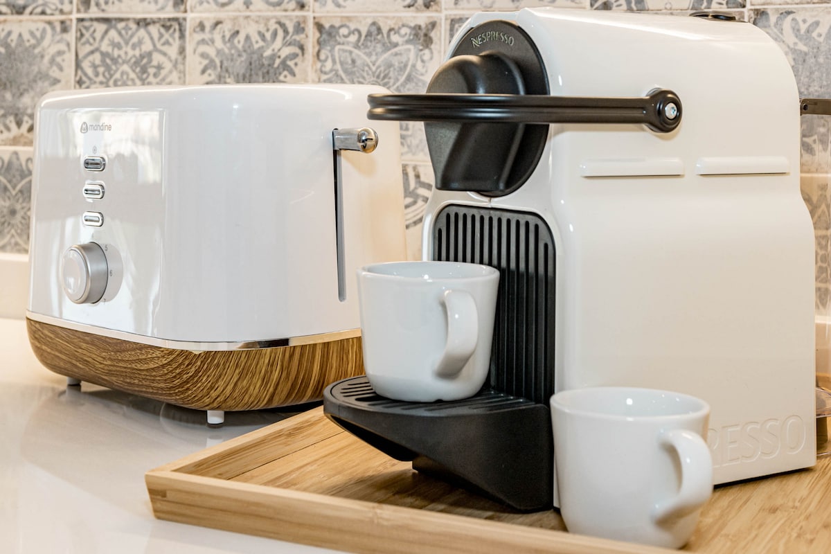 The open plan kitchen, electric, is equipped with refrigerator, microwave, oven, freezer, dishwasher, dishes/cutlery, kitchen utensils, toaster and kettle.
