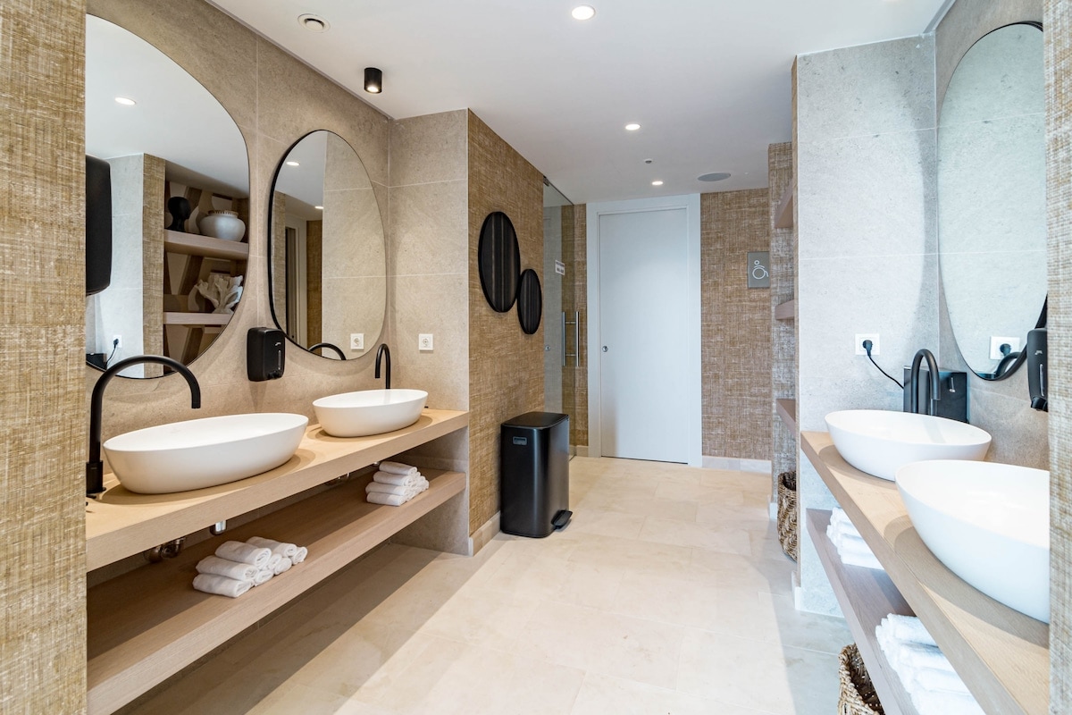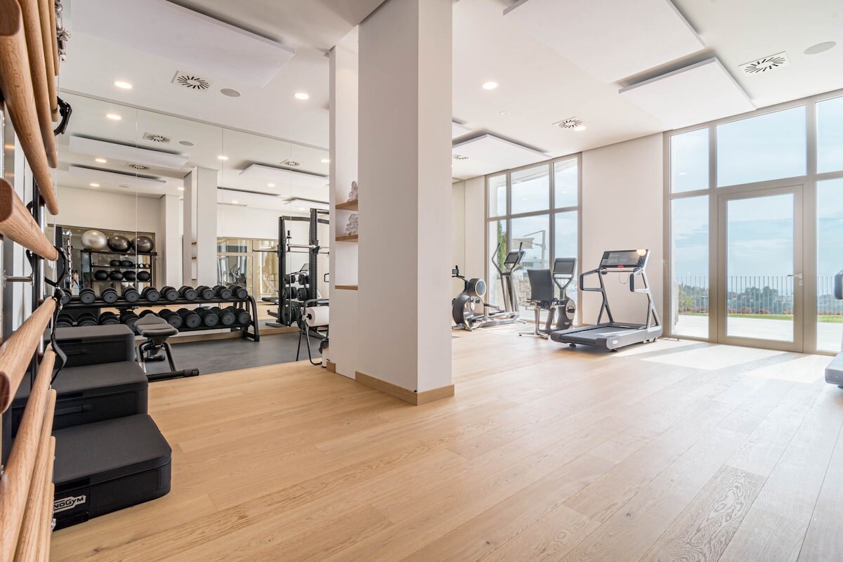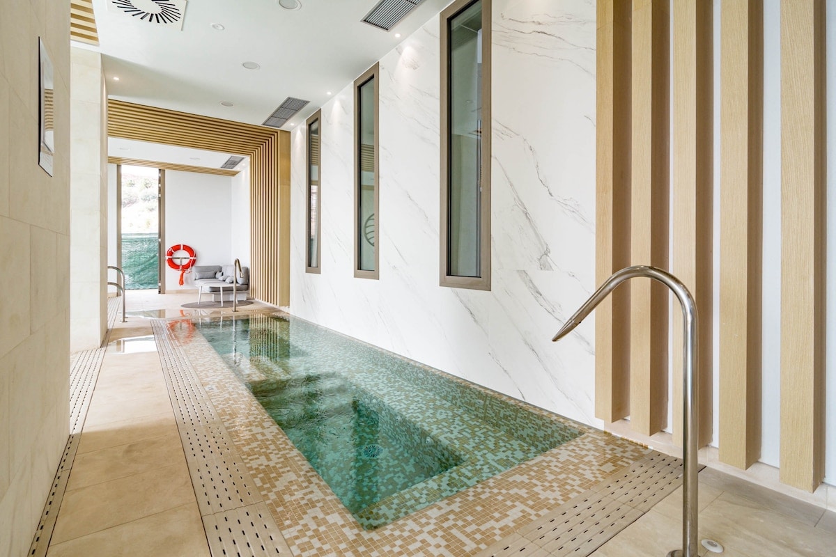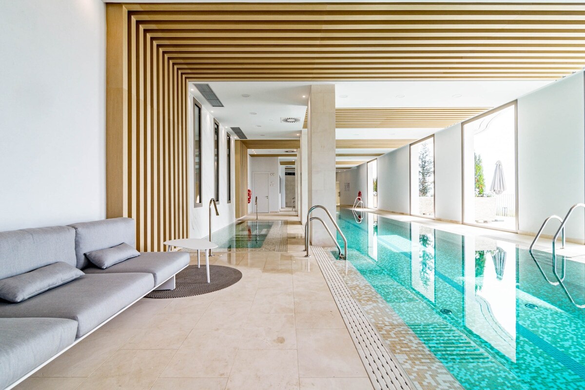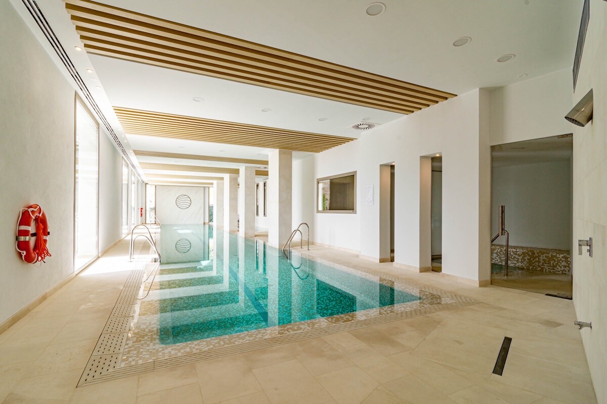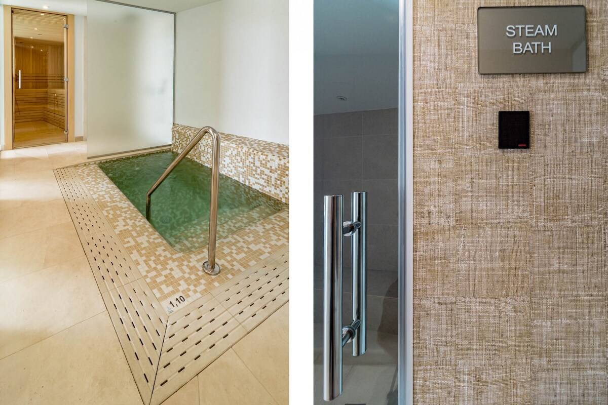 The accommodation is equipped with the following items: washing machine, dryer, iron, internet (Wi-Fi), childrens area, gym / fitness centre, sauna, hot tub, central heating, air-conditioned, swimming pool communal, heated swimming pool communal, covered parking in the same building, 1 fan, Tv.