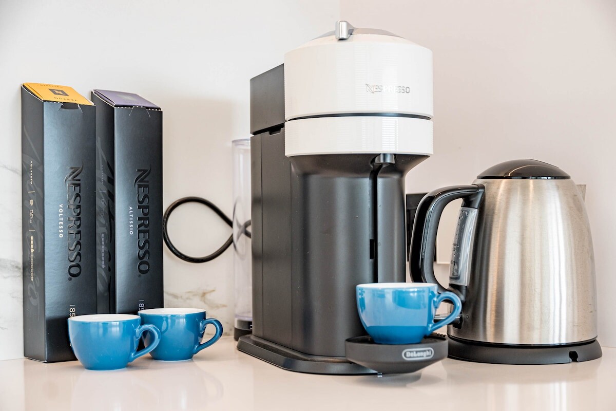 The open plan kitchen is equipped with refrigerator, microwave, oven, freezer, dishwasher, dishes/cutlery, kitchen utensils, toaster, kettle and juicer.