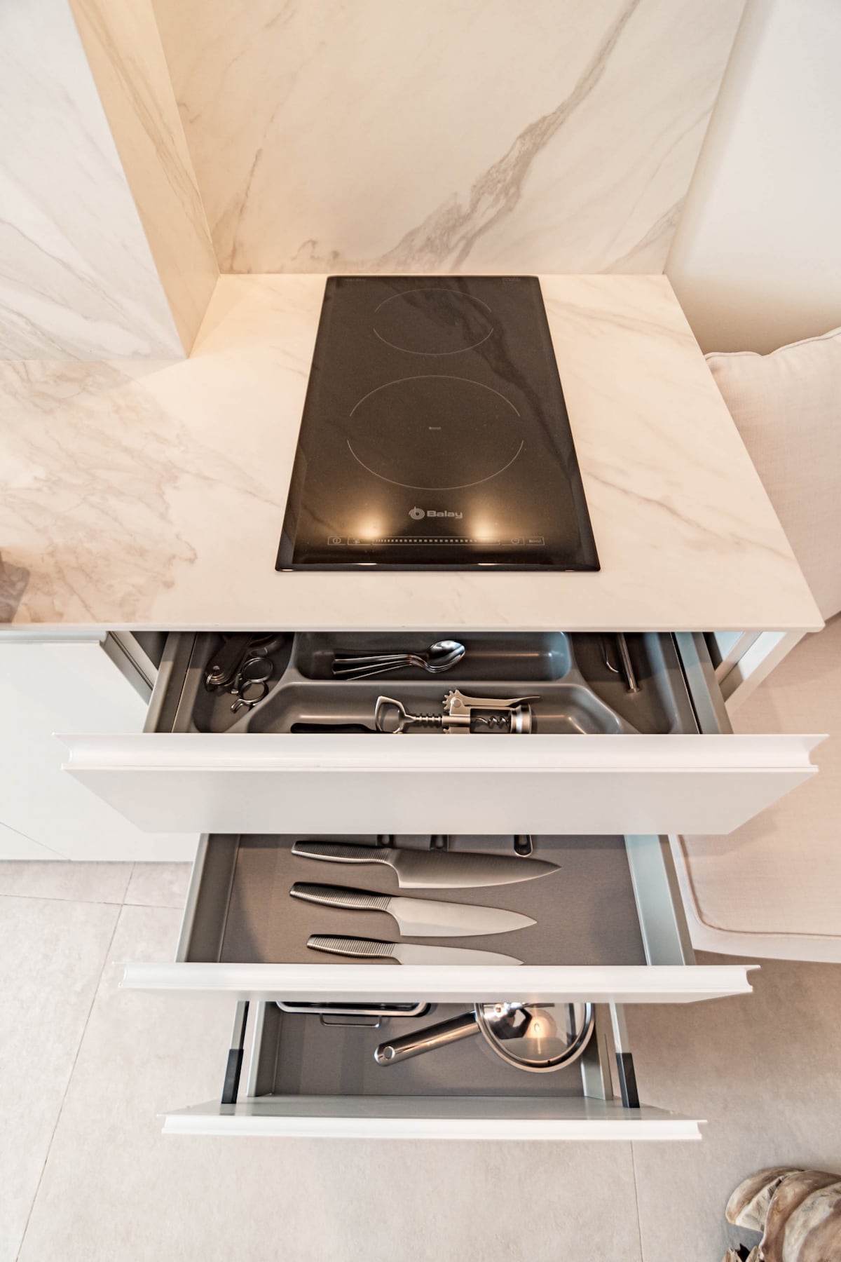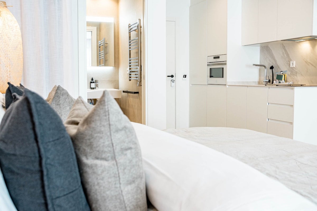 The suite has one bedroom with a king size bed, some will be connecting suites for families with an open plan layout. Fully equipped kitchen including combined washing/dryer machine and bathroom with an average size of 35 square metres.