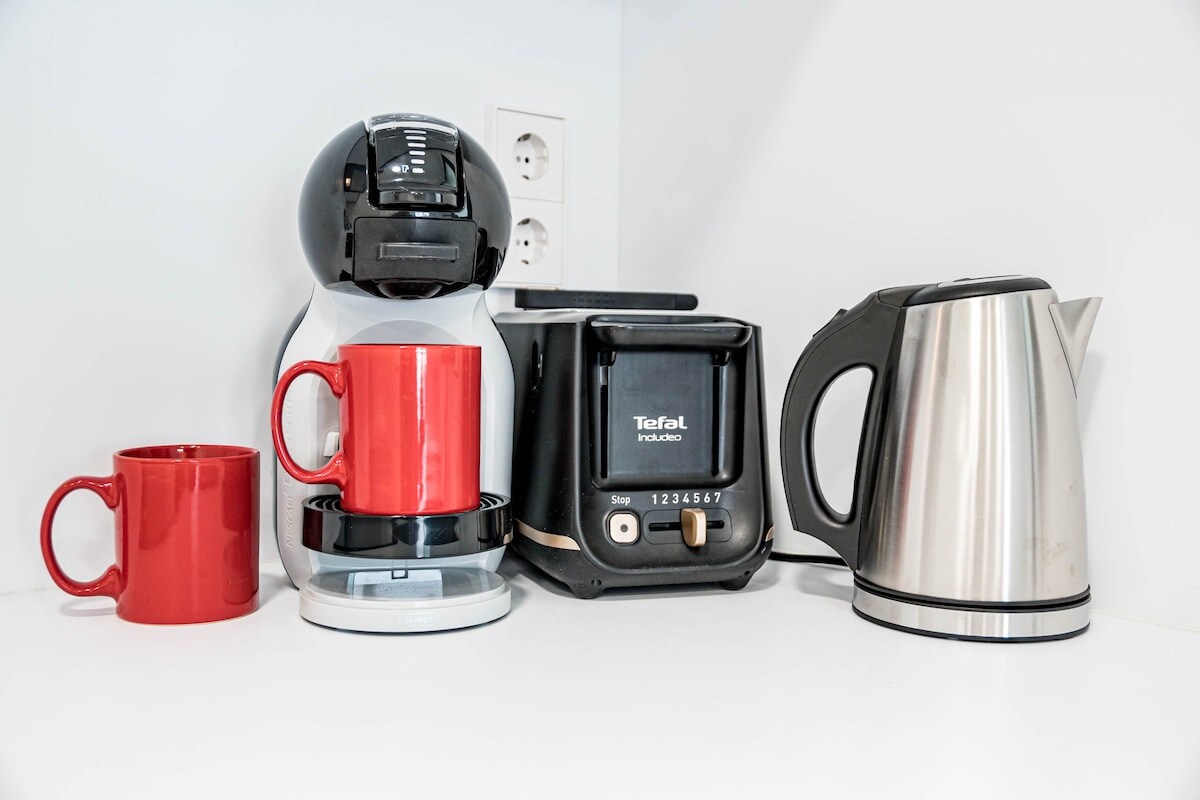 In the electric open plan kitchen, refrigerator, microwave, oven, freezer, washing machine, dryer, dishwasher, kitchen utensils, coffee machine, toaster and kettle are provided.