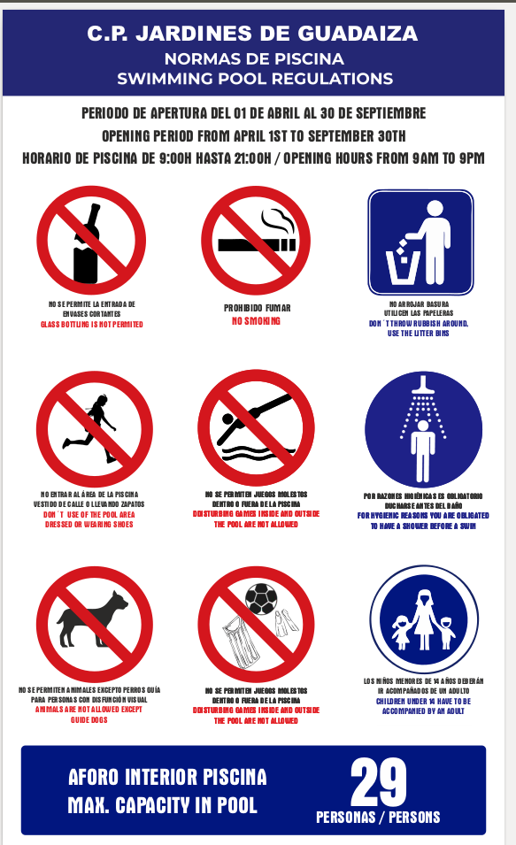Swimming Pool Regulations – Jardines de GuadaizaOpening period: April 1st to September 30th