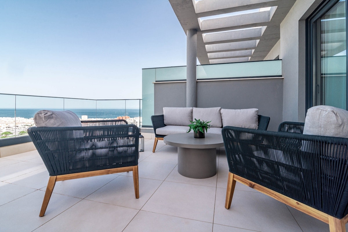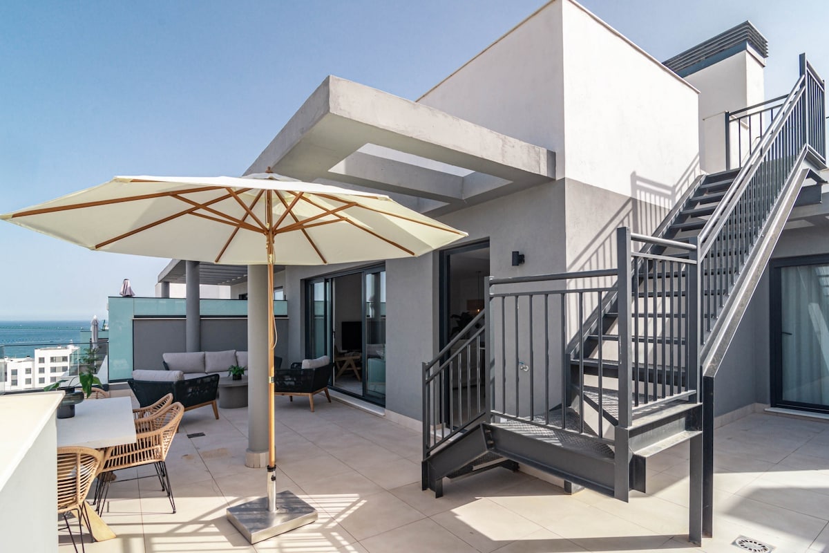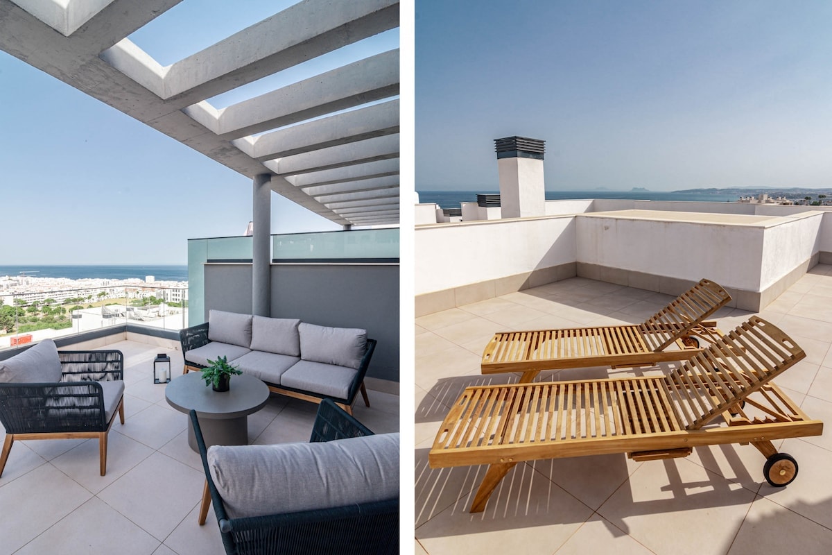 To take in all the beautiful views from the large terrace (150 m²) and solarium, there are comfortable seating areas for you to soak in the sun, relax in the shade, and watch the beautiful sunrise and sunsets over the mountain and ocean.