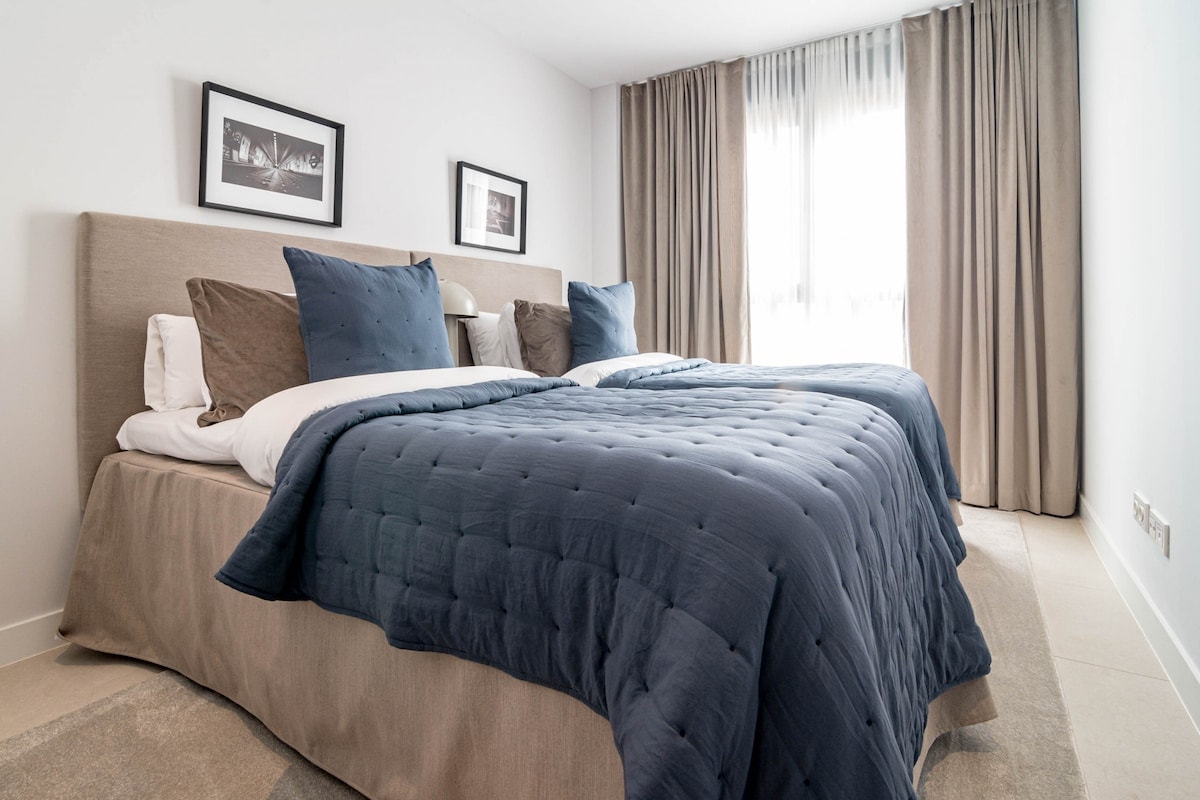 The lovely open kitchen has been exceptionally stocked with all the necessities you need to cook a wonderful meal at home: induction cooktop, oven, dishwasher, washing machine, kettle, Nescafe Dolce Gusto coffee maker, pots and pans, baking dishes, serving trays, plates, bowls, cups, wineglasses, and more. The apartment has been equipped with a smart TV, high-speed internet, and satellite IPTV (Languages: Spanish and English).