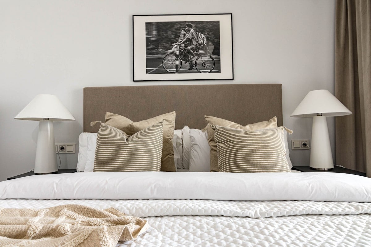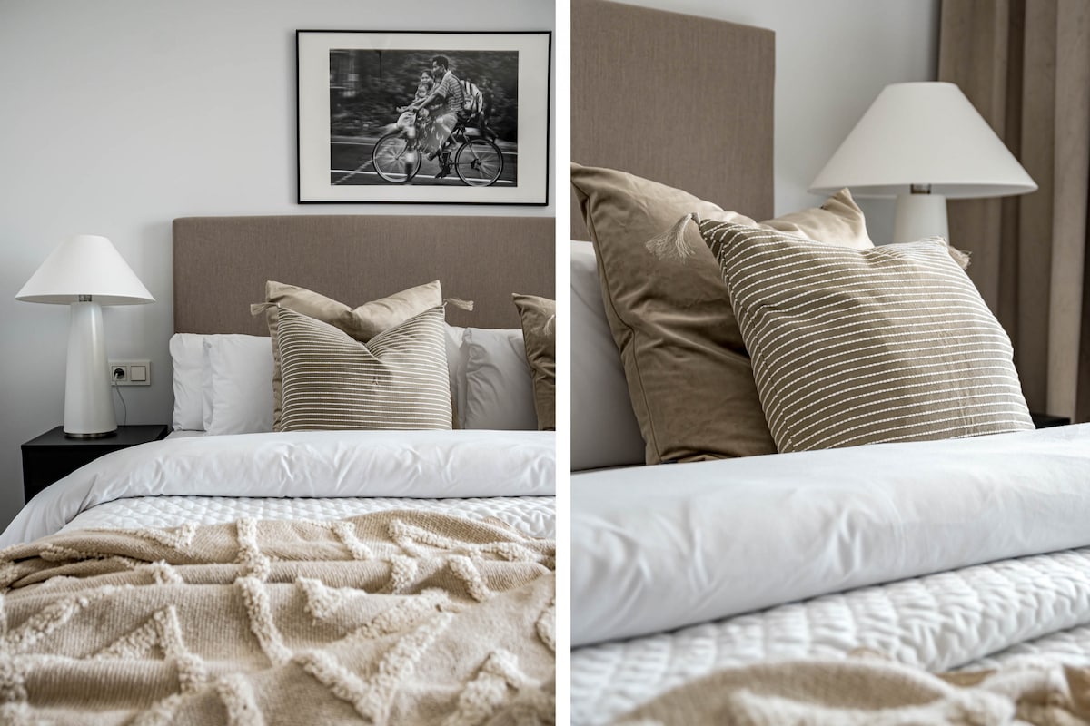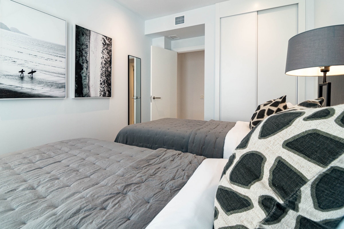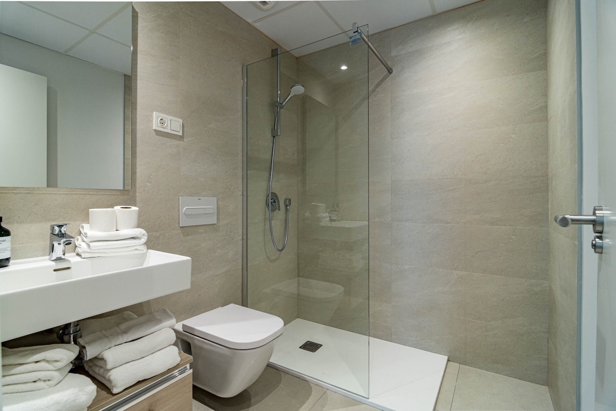 We were 2 families (8 people) staying in the apartment. We were very happy with the accommodation, it was clean and fresh. 4 bedrooms but only 2 toilets with shower so desirable with 1 more shower when we were so many people. In bathroom with only toilet which is good. Fresh and good kitchen/sofa and dining table where we could hang out. Relatively large terrace where we could easily fit all 8. Also space for sofa and armchairs where it was nice to sit in em. 1 parking space in the garage but it was easy to park car no. 2 just outside. It took about 12-15 minutes to walk down to the harbor but it was hilly so quite difficult to walk home. About 10 minutes walk to grocery stores (Lidl, Mercadona), Aptoket. A great place to stay where 2 families can easily stay and hang out together. Contact with RoomService great, key was picked up in key bin and a short video was sent with so you could see how to get to the home and garage. We can absolutely recommend this home.