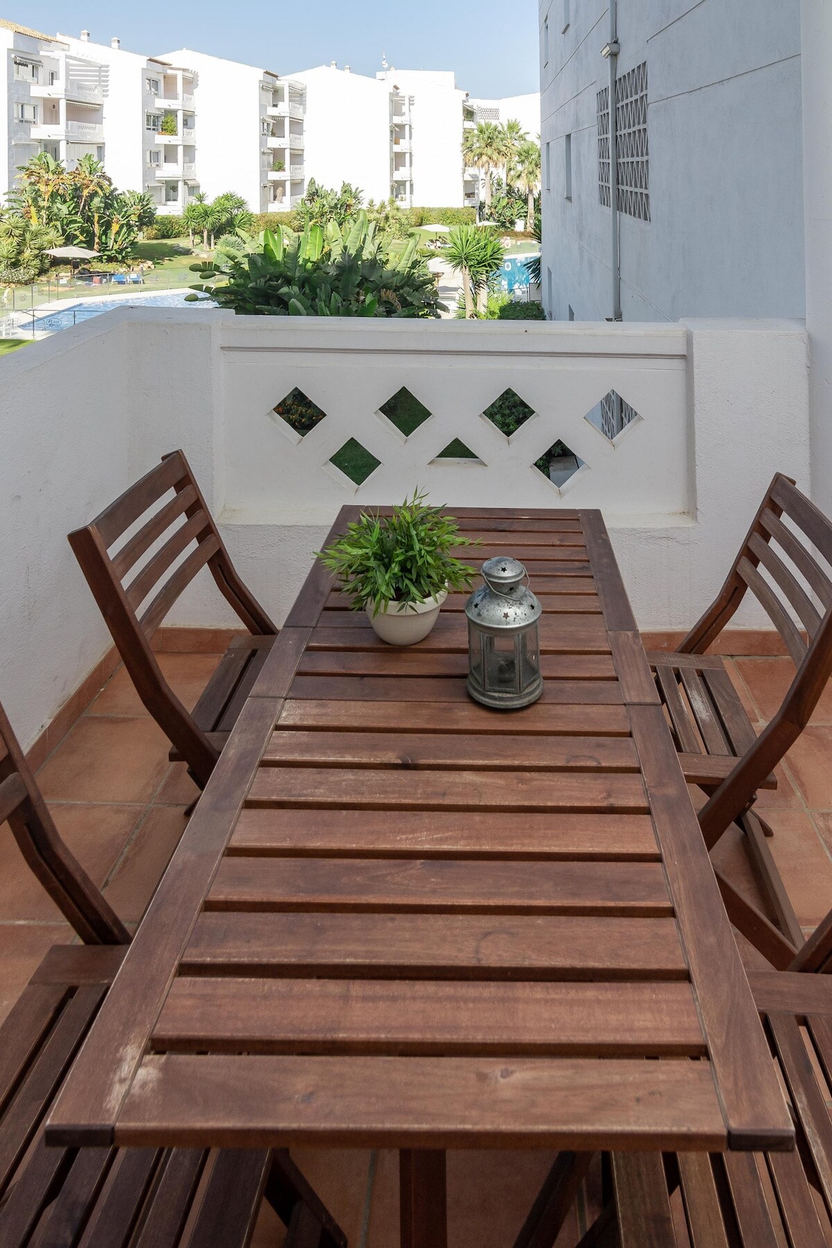 The accommodation is equipped with the following items: lift, garden, garden furniture, terrace, barbecue, iron, internet (Wi-Fi), hair dryer, balcony, central heating, air-conditioned, communal swimming pool, garage the same building, Tv, tv satellite (Languages: Spanish, English).