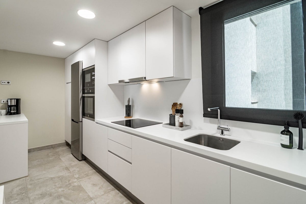 In the induction open plan kitchen, refrigerator, microwave, oven, freezer, washing machine, dryer, dishwasher, dishes/cutlery, kitchen utensils, coffee machine, toaster, and kettle are provided.