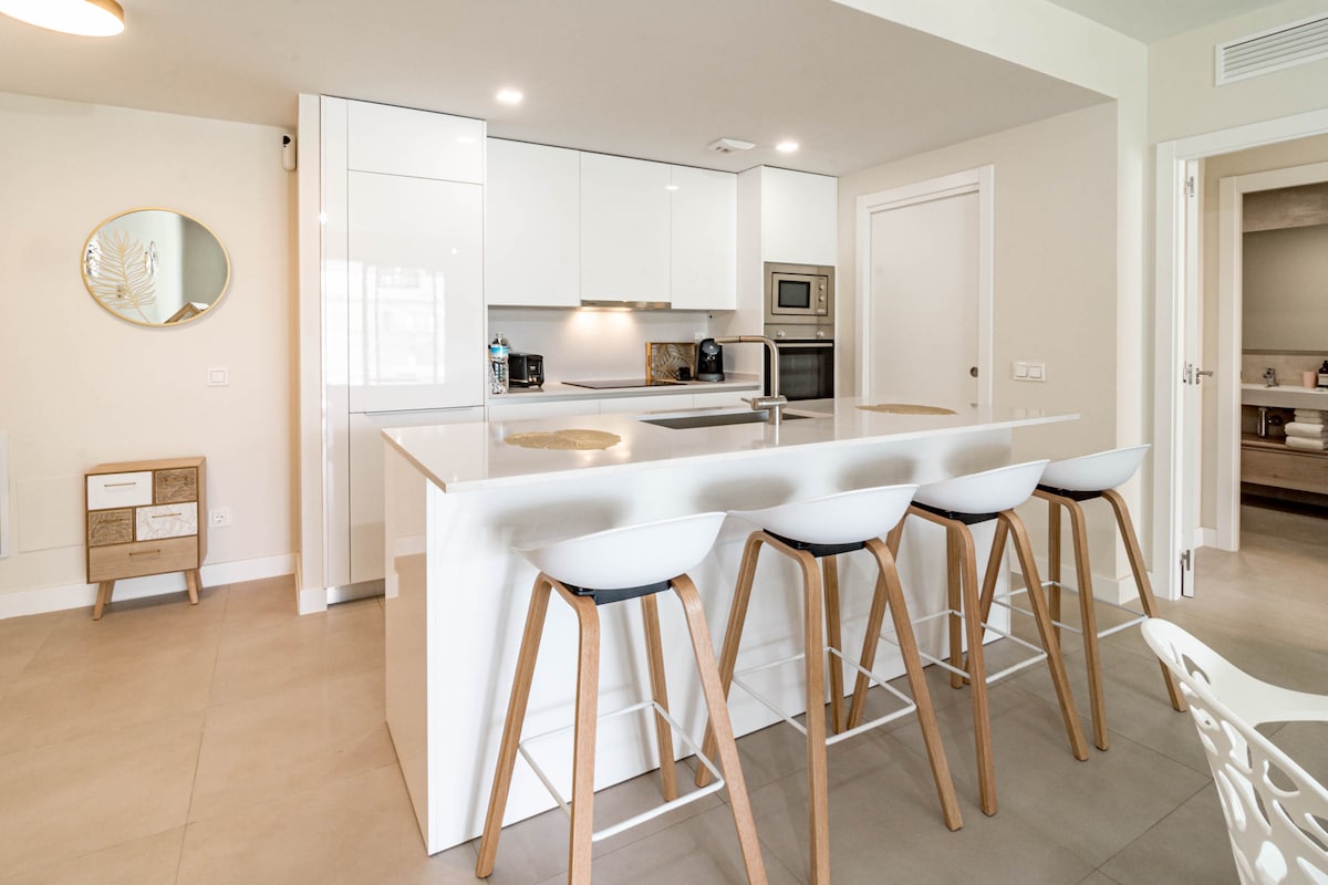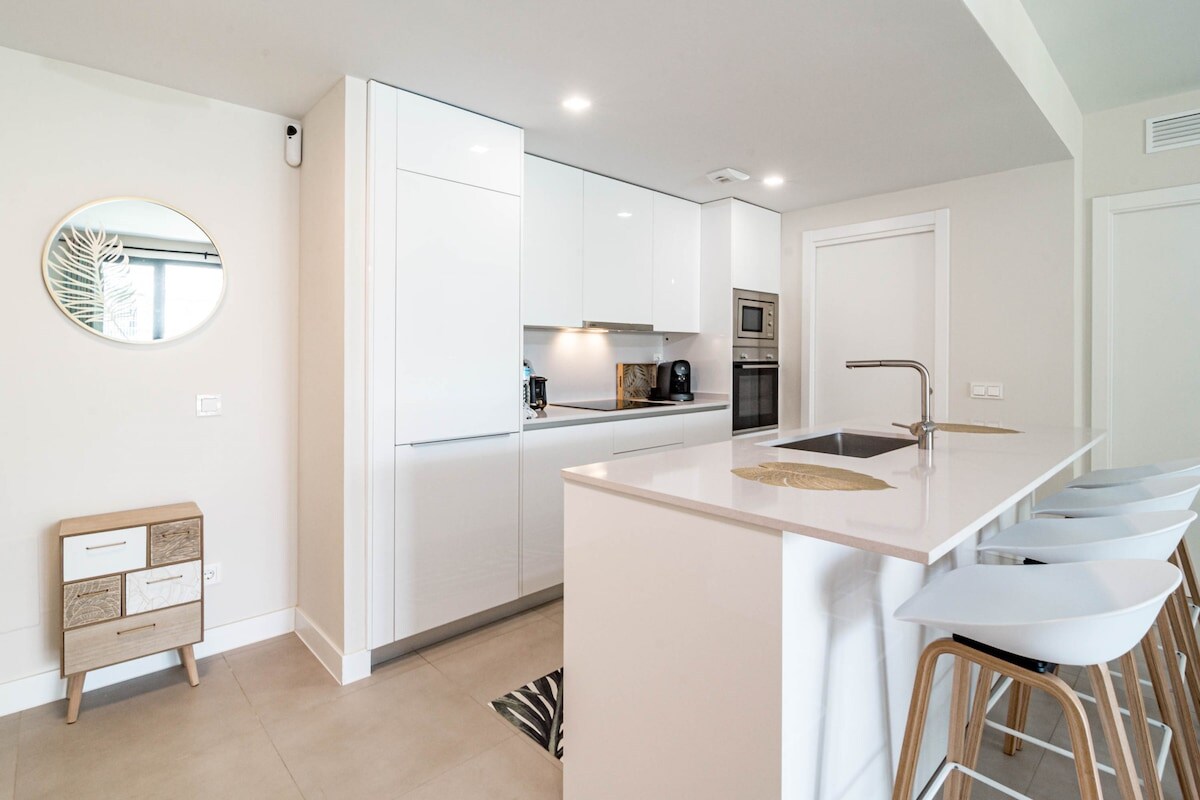 In the electric open plan kitchen, refrigerator, microwave, oven, freezer, washing machine, dishwasher, dishes/cutlery, kitchen utensils, coffee machine, toaster, kettle, and juicer are provided.