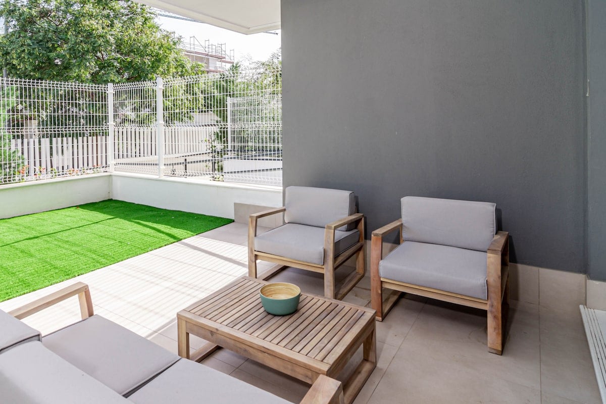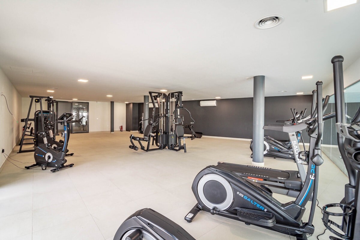 The accommodation is equipped with the following items: garden, garden furniture, fenced garden, terrace, iron, internet (Wi-Fi), hair dryer, gym / fitness centre, alarm, central heating, air-conditioned, communal swimming pool, communal heated swimming pool, garage in the same building, 1 fan, and 1 TV.