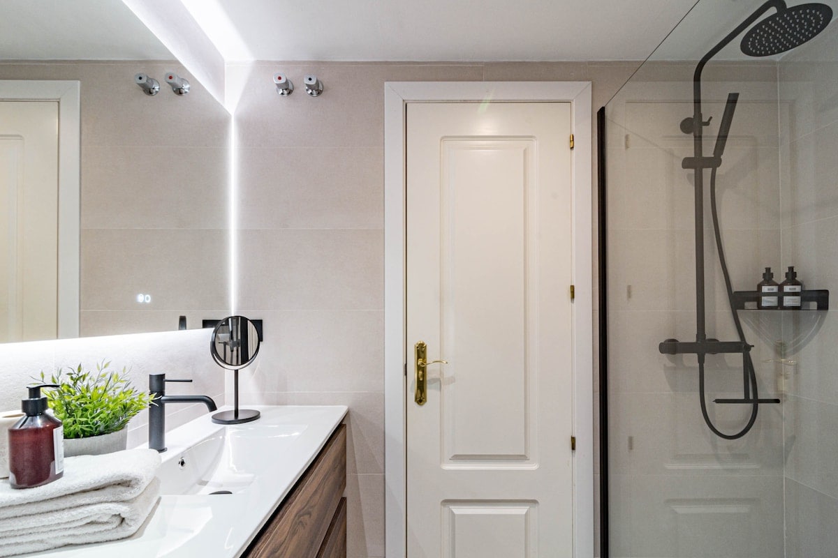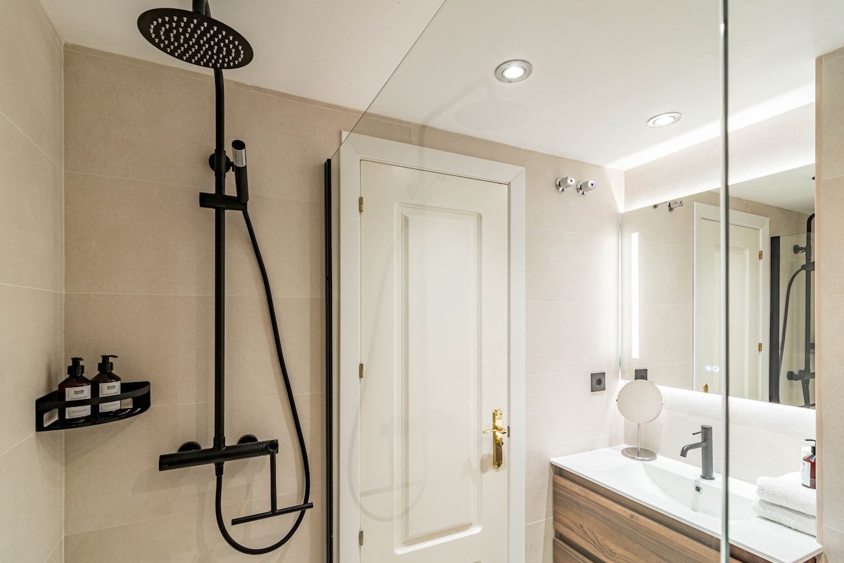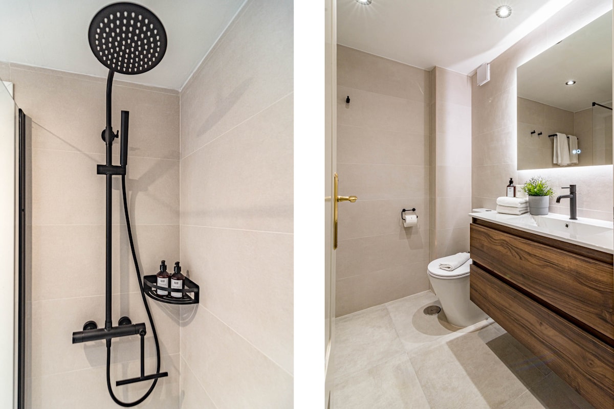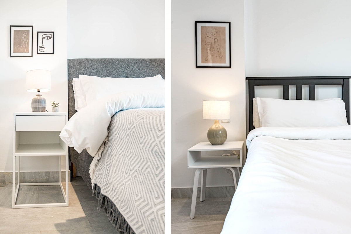 The apartment features two bedrooms with a versatile sleeping arrangement - one queen-size bed and two individual beds - ensuring comfortable rest for everyone.