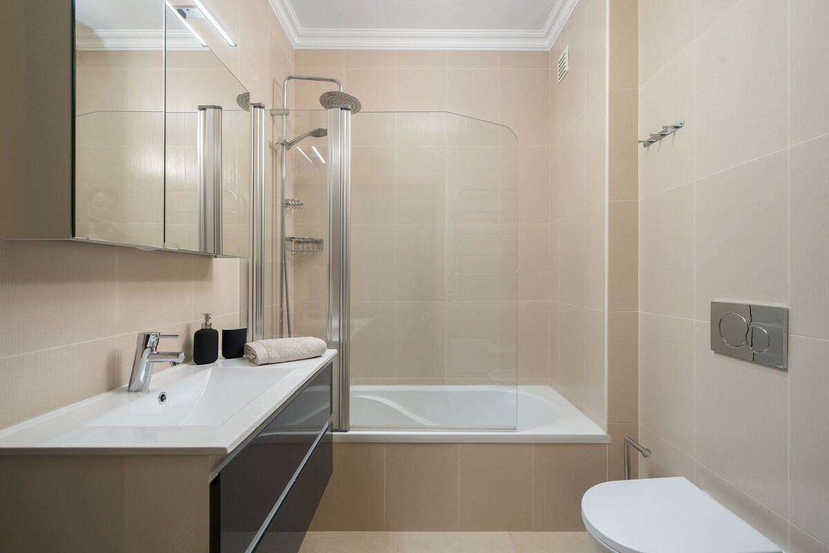 With two bedrooms and two bathrooms, the apartment comfortably sleeps up to four guests. Sink into the plush sofa in the private living room, or gather around the dining table for memorable meals prepared in the well-equipped kitchen.