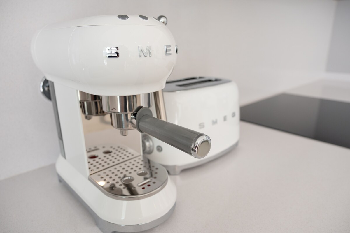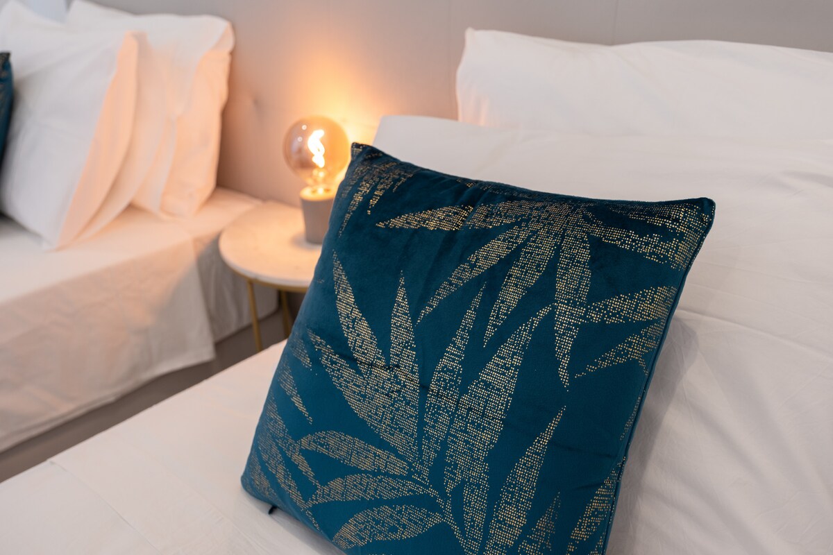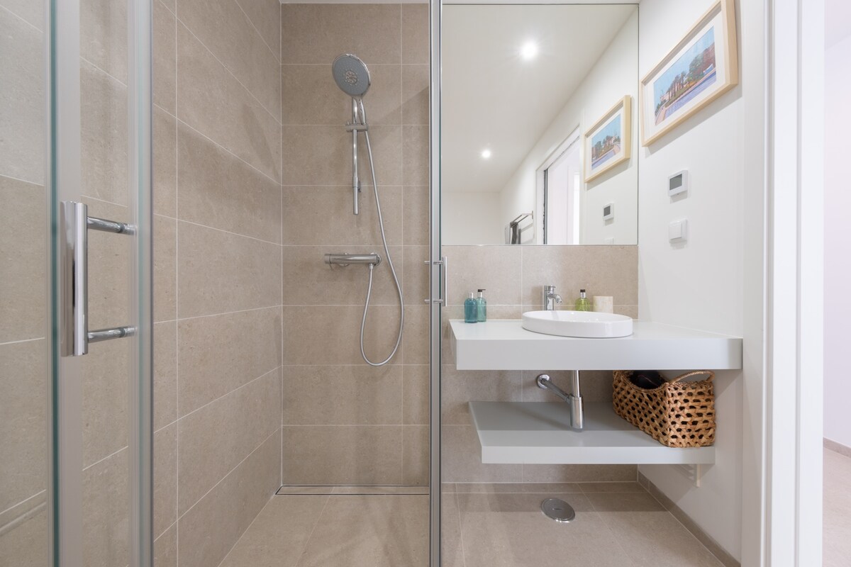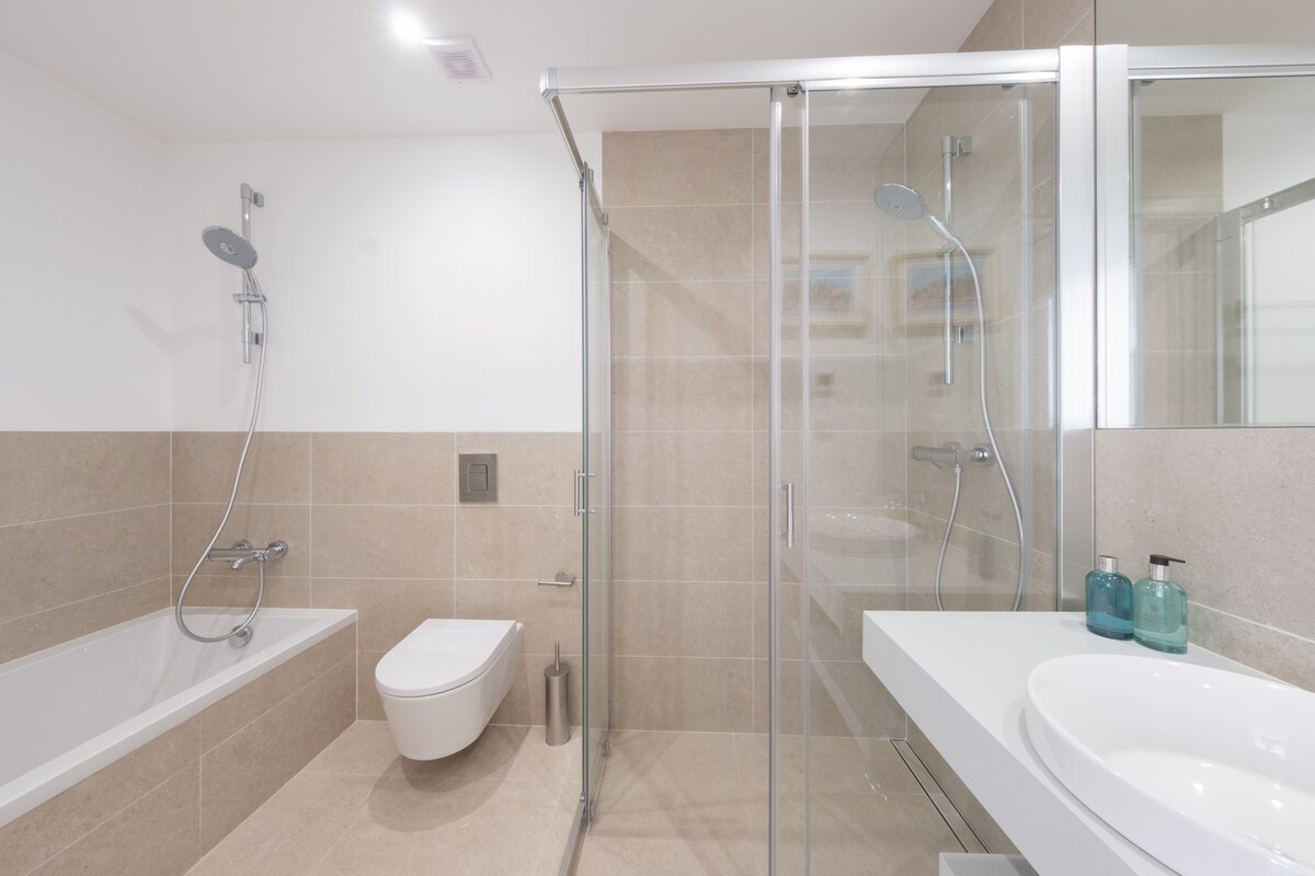 Retire to the peaceful bedrooms - one with a king-size bed and thew other with two single beds, accommodating up to four guests comfortably. The apartment also boasts two bathrooms, one with a shower and the other with a bathtub, ensuring everyone has their own space to refresh.