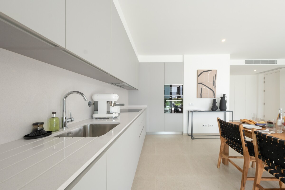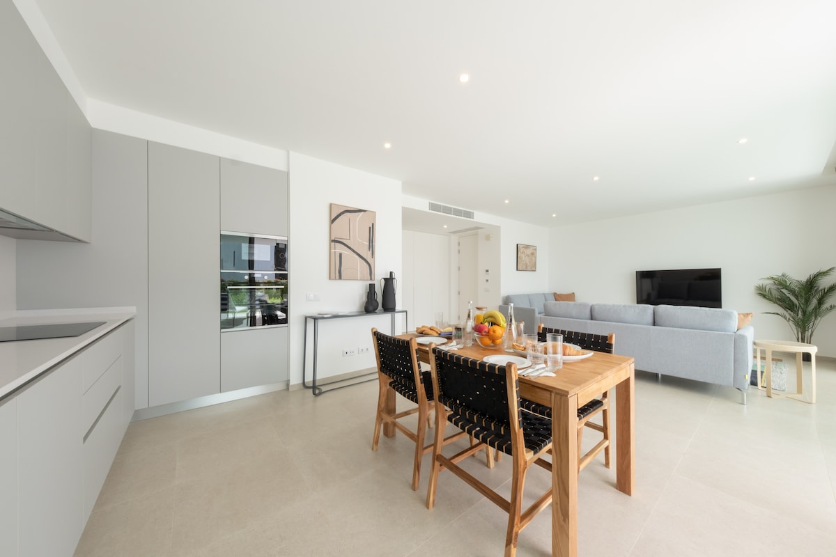 The apartment features a spacious and airy layout, with a private living room, dining area, and fully equipped kitchen.