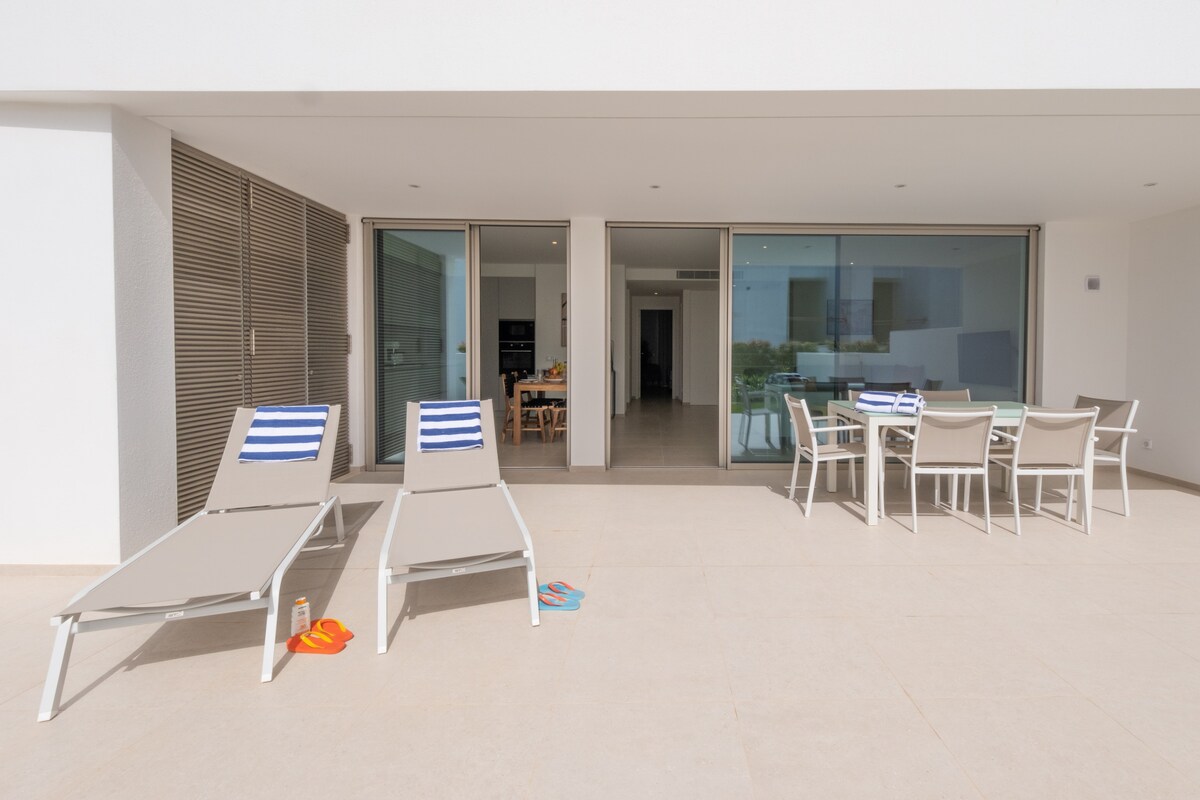 Step outside and enjoy the shared outdoor pool, perfect for a refreshing dip on those warm Algarve days. The apartment also features a private terrace, where you can dine al fresco or simply soak up the sun while relaxing.