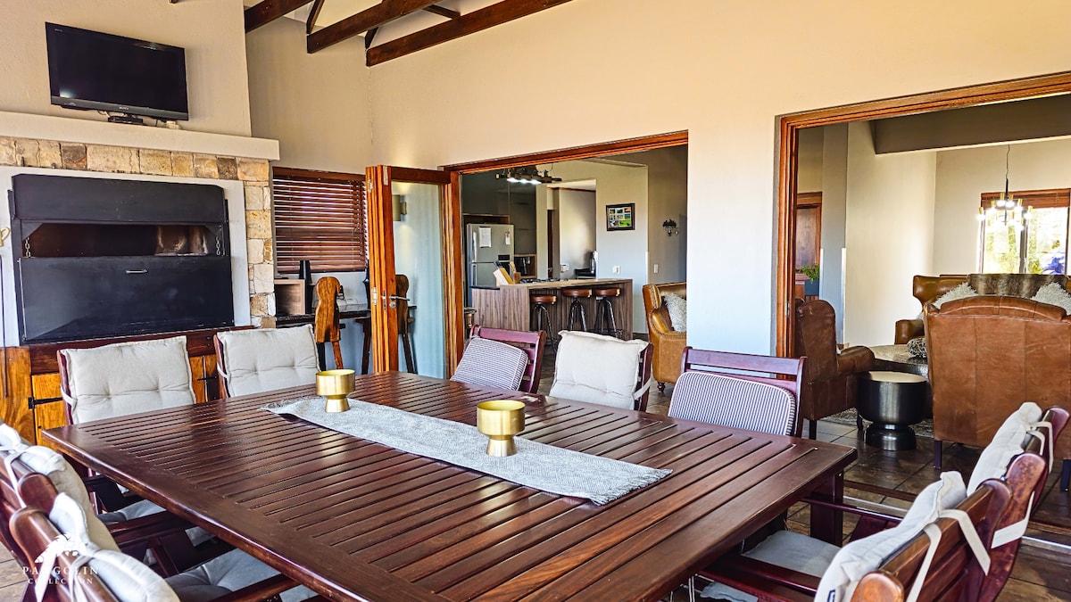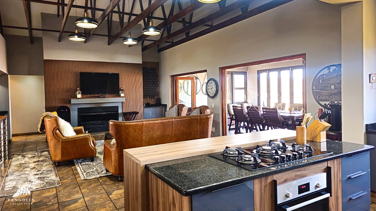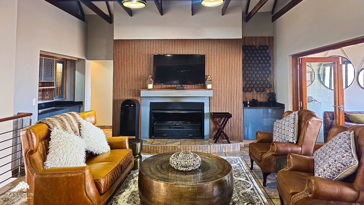 The open-plan lounge and dining area invite relaxation with comfortable seating, an indoor wood-burning fireplace, and a TV with full DStv channels. Free WiFi keeps you connected, and portable fans, heating, and room-darkening shades help manage comfort in any season.