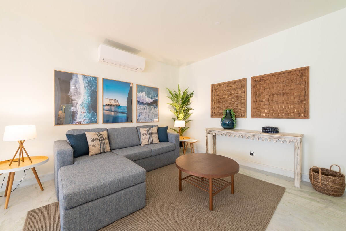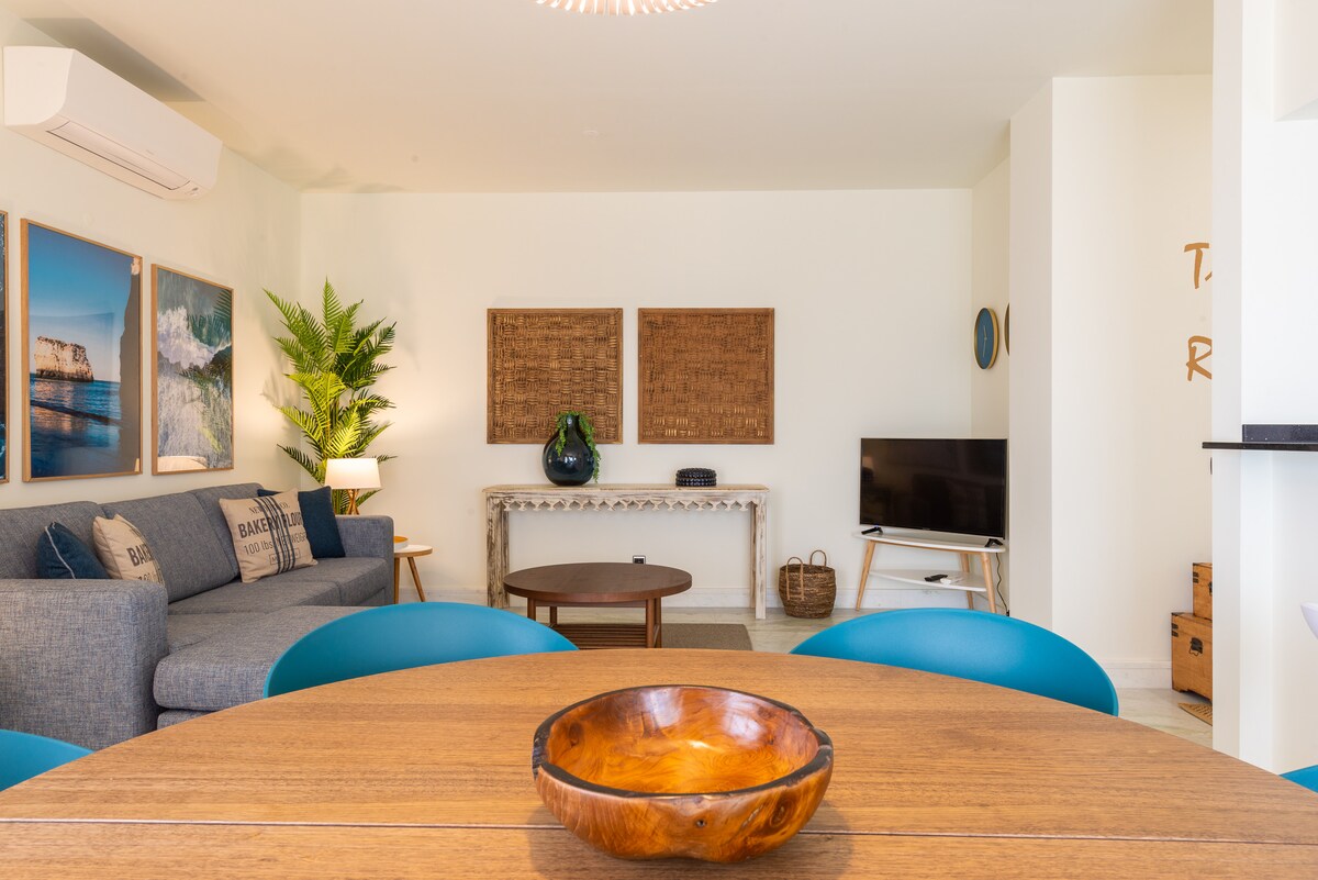 Enjoy the sea breeze and stunning ocean views from the private balcony, the perfect spot to unwind after a day of adventure. The apartment also boasts a cosy living room, complete with a flatscreen Tv and comfortable seating, providing a comfortable space to relax and spend quality time with your loved ones.