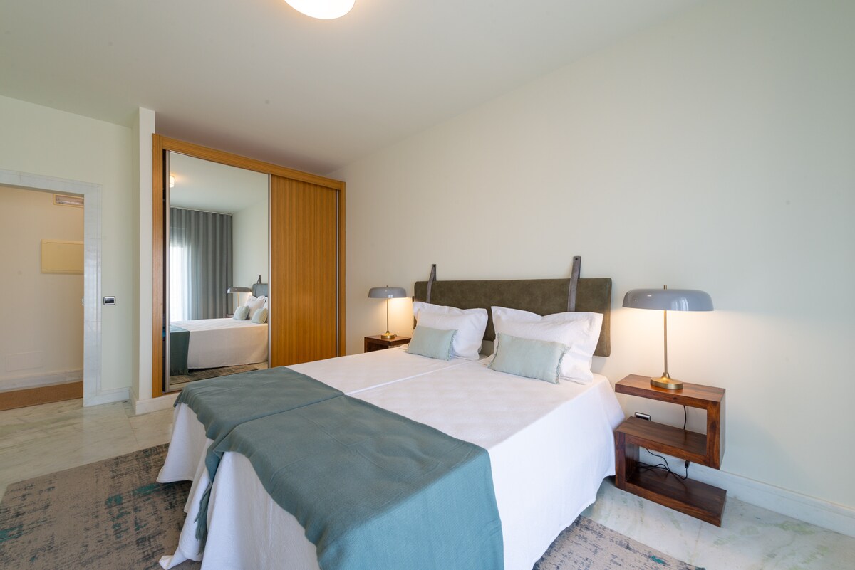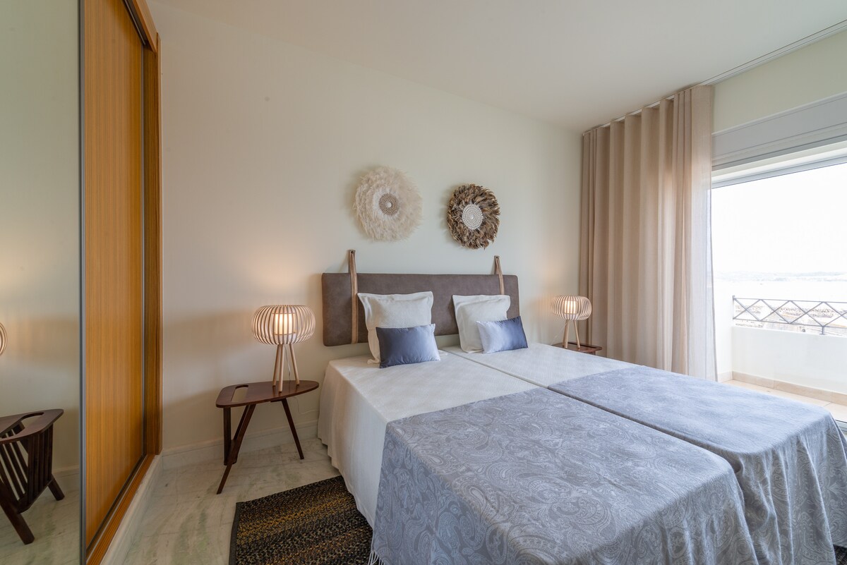 We really enjoyed our stay in Lagos. We spent a week at this location after spending the first week between Porto and Lisbon so we were looking to relax. The location is perfect. It was so nice to wake up to this beautiful view and end the day on the balcony just watching the water and activities. The condo is beautiful. There is a musty smell in the front bathroom as previously mentioned. There was more than enough room for two couples to be together but also have privacy. We enjoyed walking to so many restaurants and shops. We took the train in and walked to this location so very accessible. And of course the beach is just across the street. The company was as very easy to deal with and responsive to all of our inquiries very quickly.