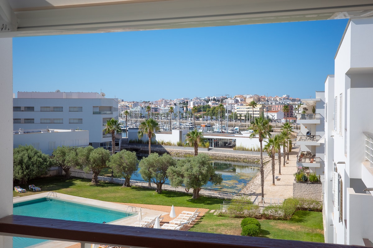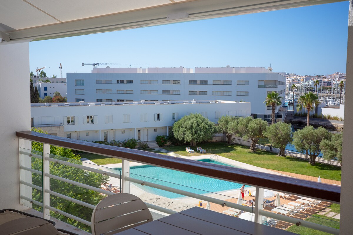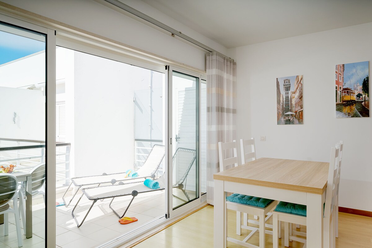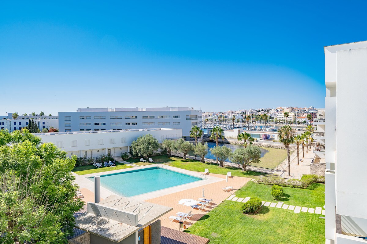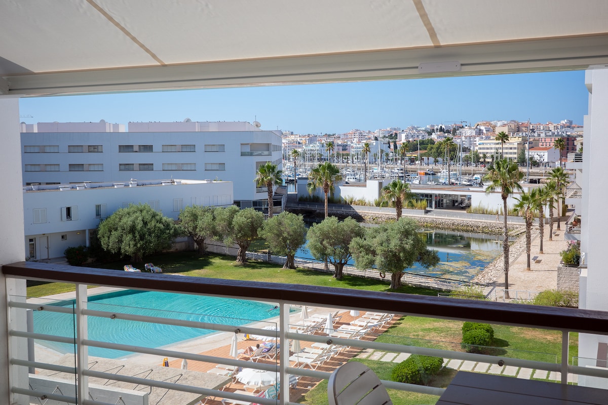 Stepping outside, you'll find a private balcony offering lovely views of the shared outdoor pool and the surrounding area. The pool is perfect for a refreshing dip on those warm Algarve days, and the outdoor furniture provides a comfortable space to relax and enjoy the sun.
