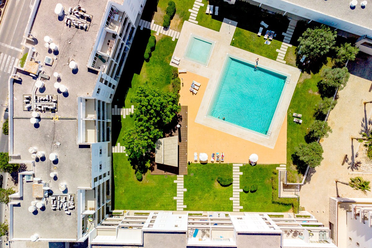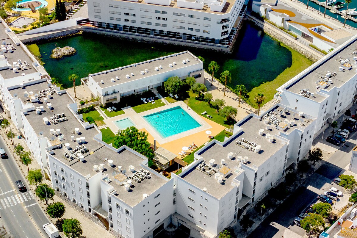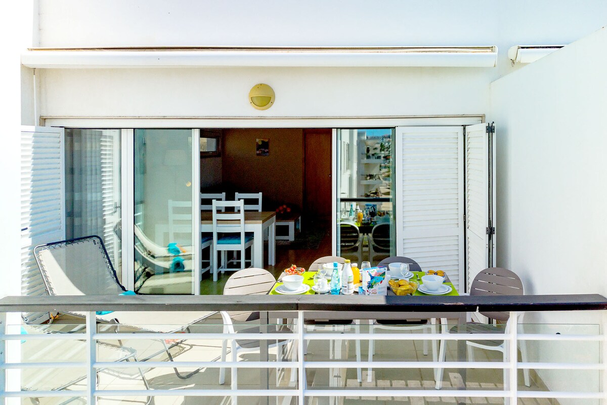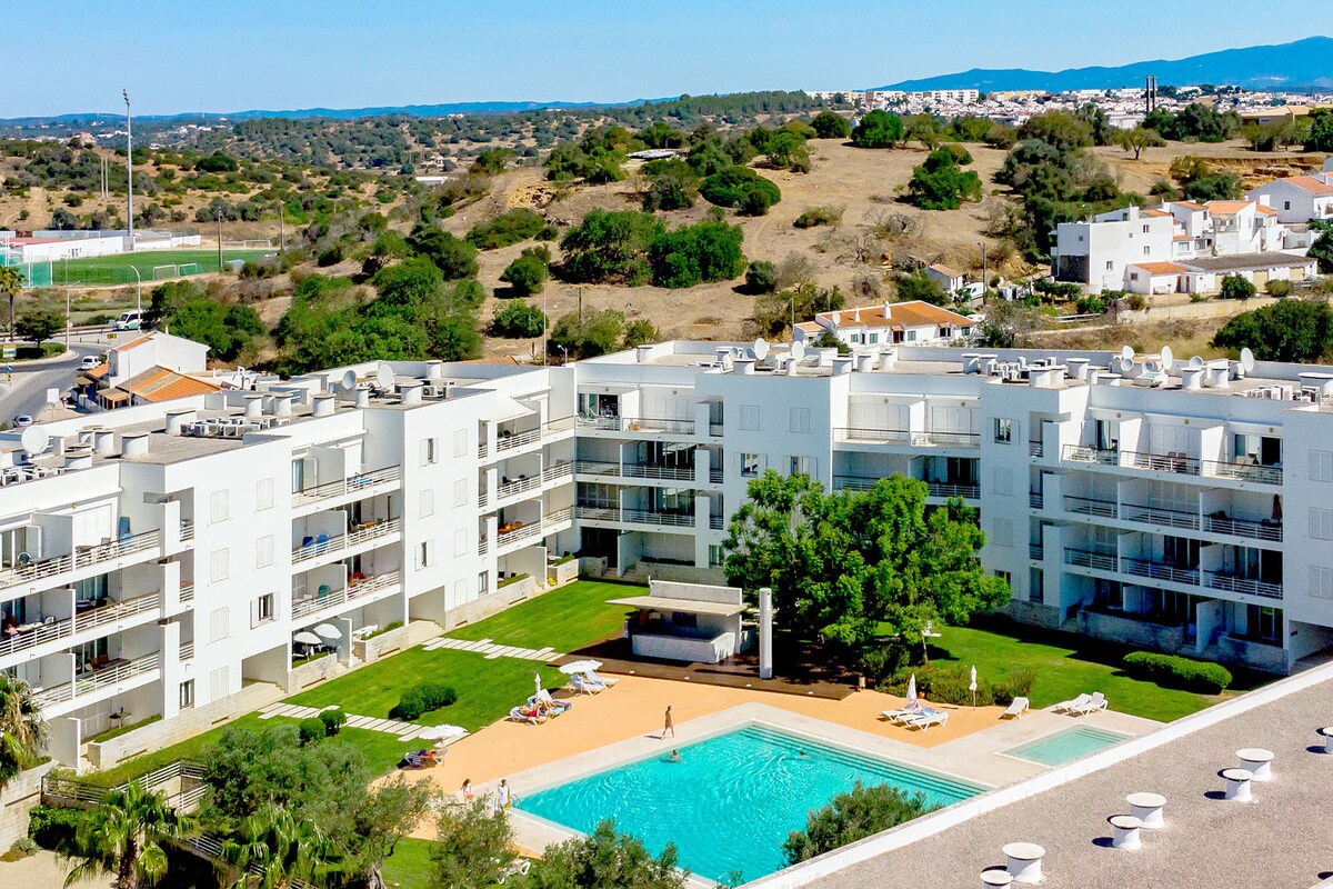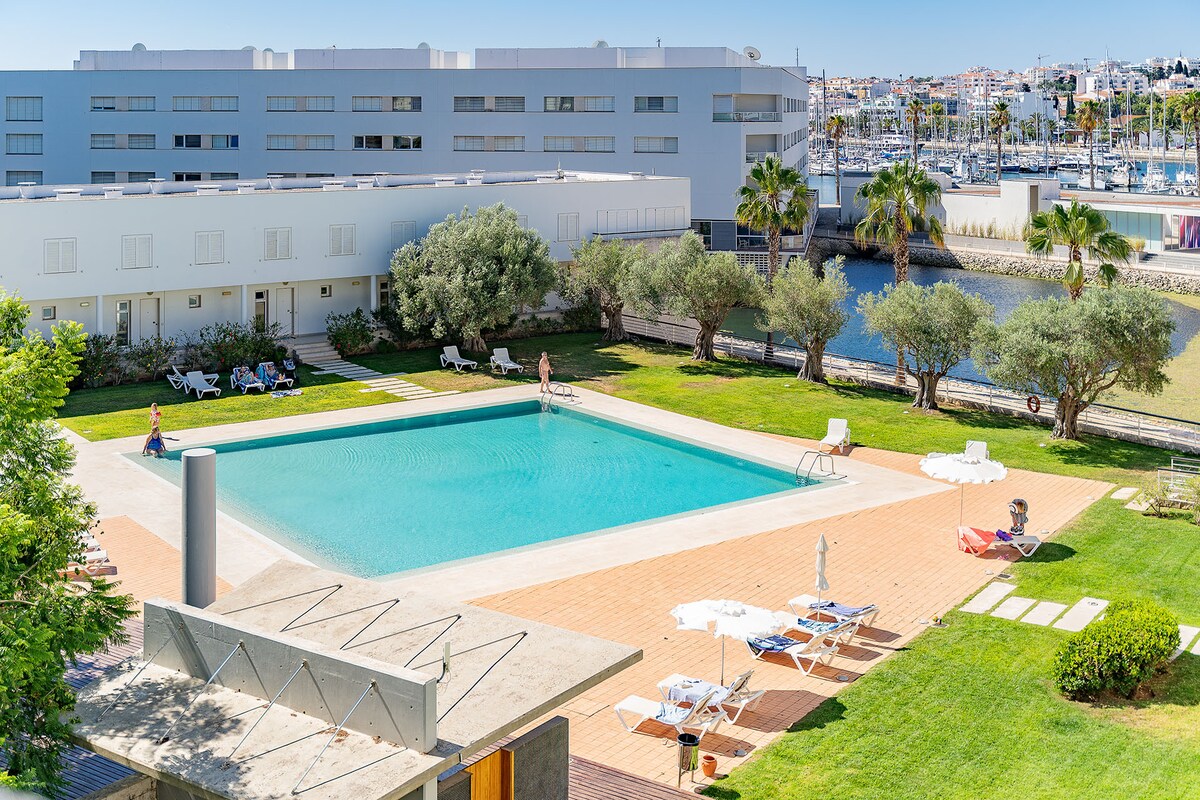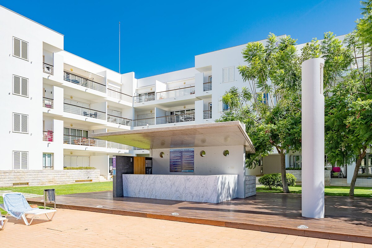 Stepping outside, you'll find a private balcony offering lovely views of the shared outdoor pool and the surrounding area. The pool is perfect for a refreshing dip on those warm Algarve days, and the outdoor furniture provides a comfortable space to relax and enjoy the sun.