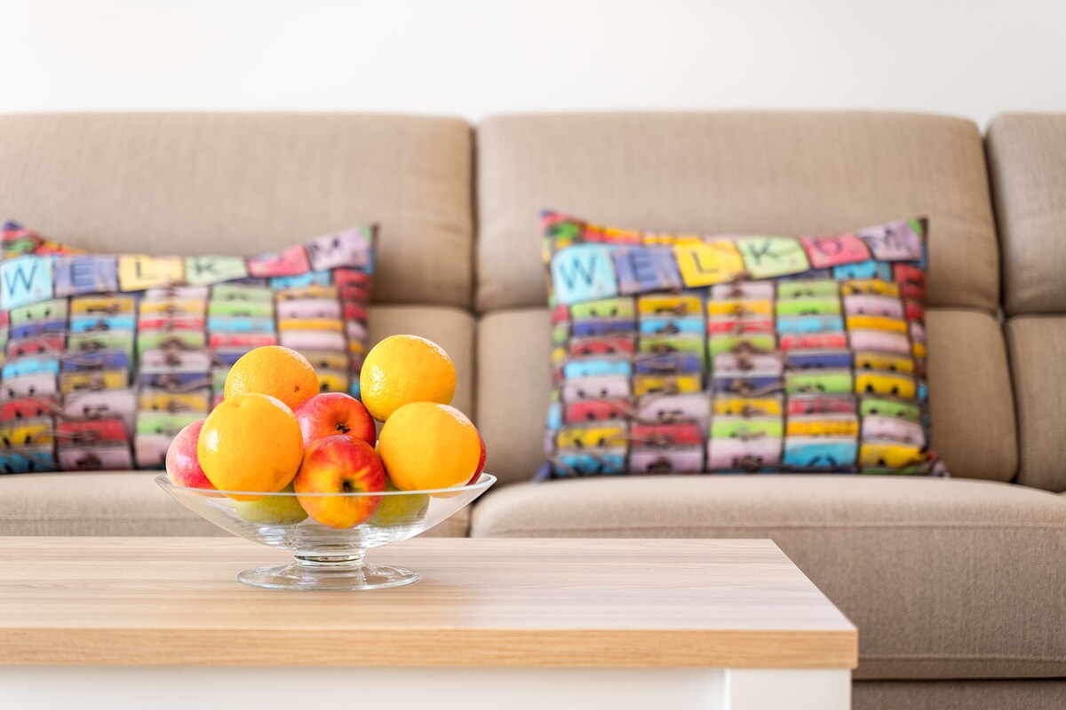 The open-plan living area is designed with comfort in mind, featuring a cozy sofa, a dining table, and a fully equipped kitchen. The kitchen is equipped with all the necessary appliances, including a fridge, freezer, oven, microwave, and dishwasher, allowing you to prepare delicious meals during your stay.