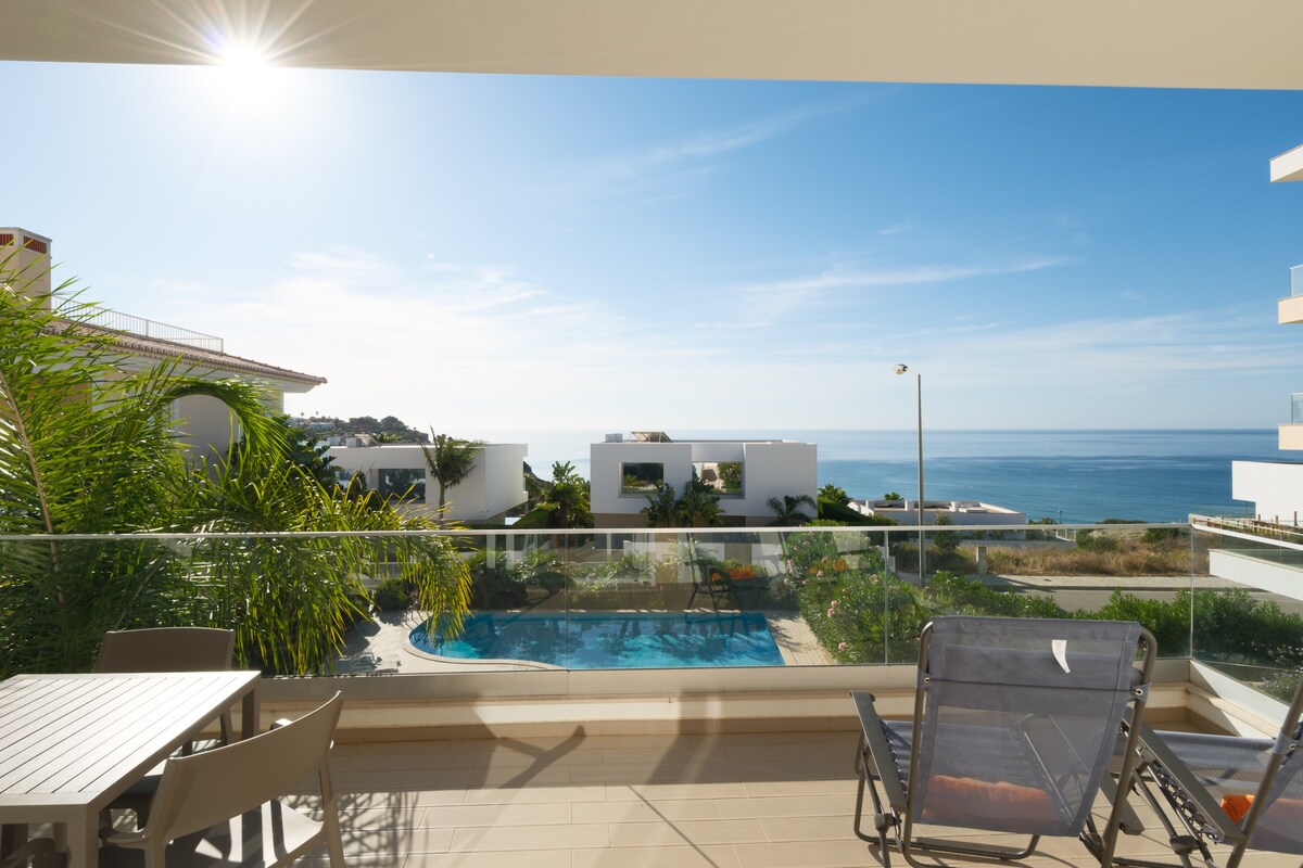 The living area is furnished with a comfortable sofa, and there is a dining table where you can enjoy your meals. The apartment also boasts a private balcony, offering stunning views of the sea and the shared pool.
