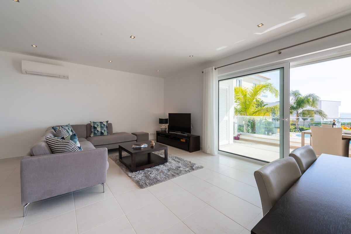 Unwind in the cozy living room, equipped with a flatscreen Tv and Dvd player, or step outside to the private balcony or shared garden area, where you can soak up the sun and admire the stunning sea views. For those seeking a refreshing dip, the shared outdoor pool is the perfect spot to cool off.