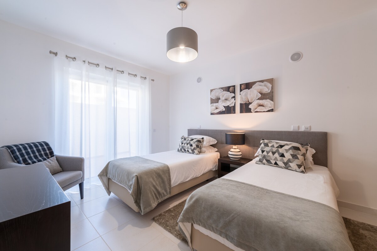 This modern and tastefully furnished apartment offers a serene and comfortable retreat for your stay. With its prime location, you'll be just a short distance from the stunning Porto de Mós beach, as well as a variety of golf courses, including the renowned Boavista Golf & Spa Resort and Espiche Golf.The apartment boasts 2 bedrooms, accommodating up to 4 guests comfortably. The master bedroom features a double bed, while the second bedroom offers 2 single beds, providing ample sleeping arrangements for families, couples, or groups of friends. The 2 bathrooms, one with a shower and the other with a bathtub, ensure everyone has their own private space to refresh.