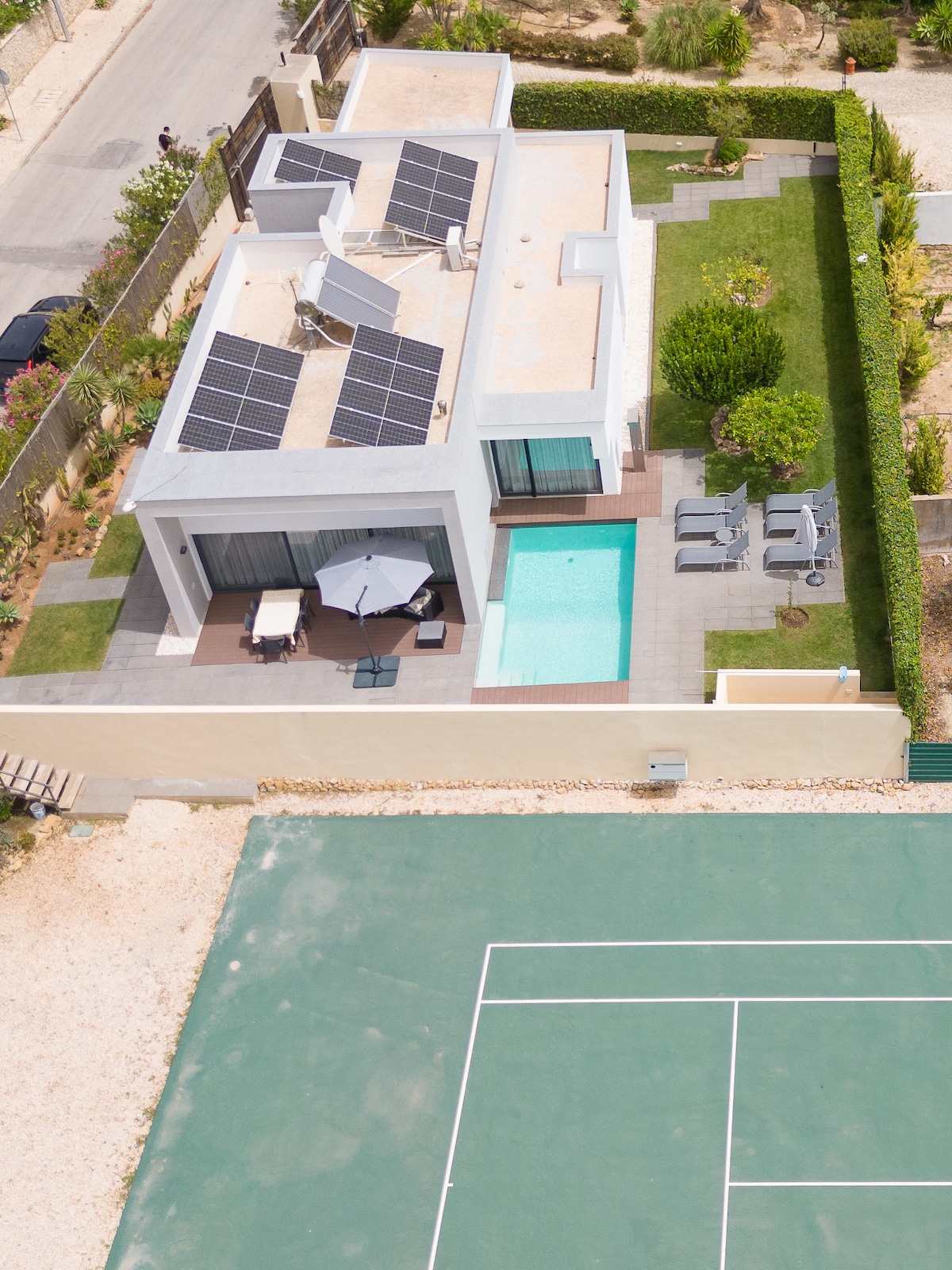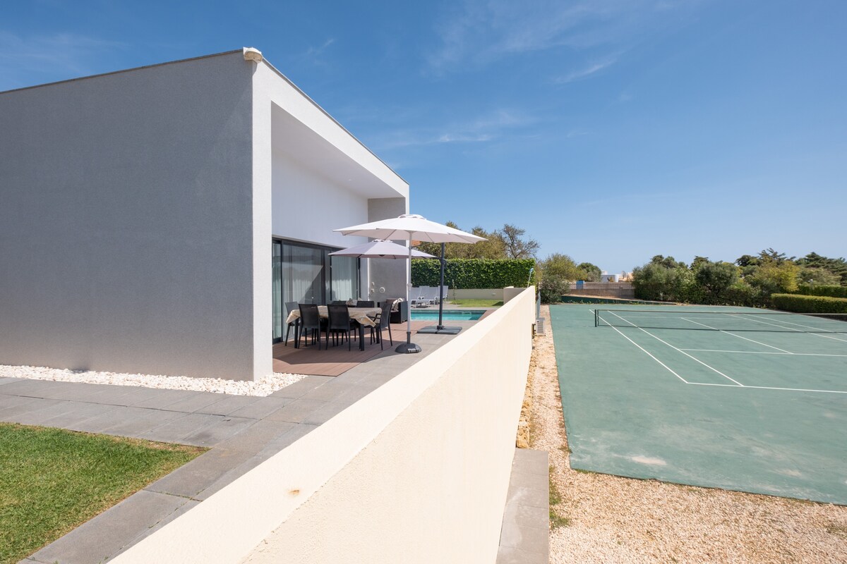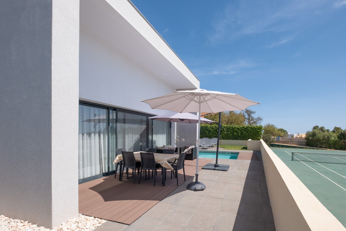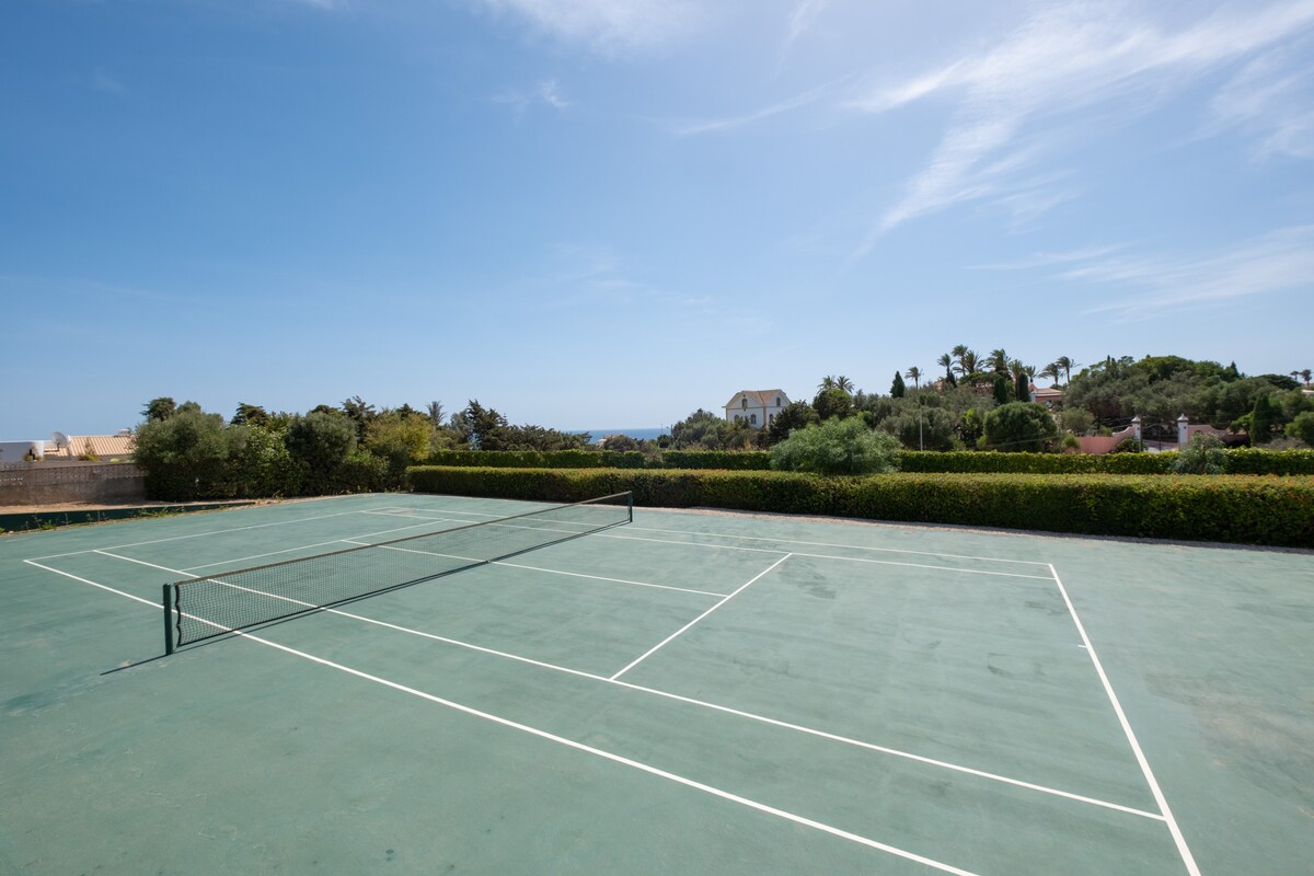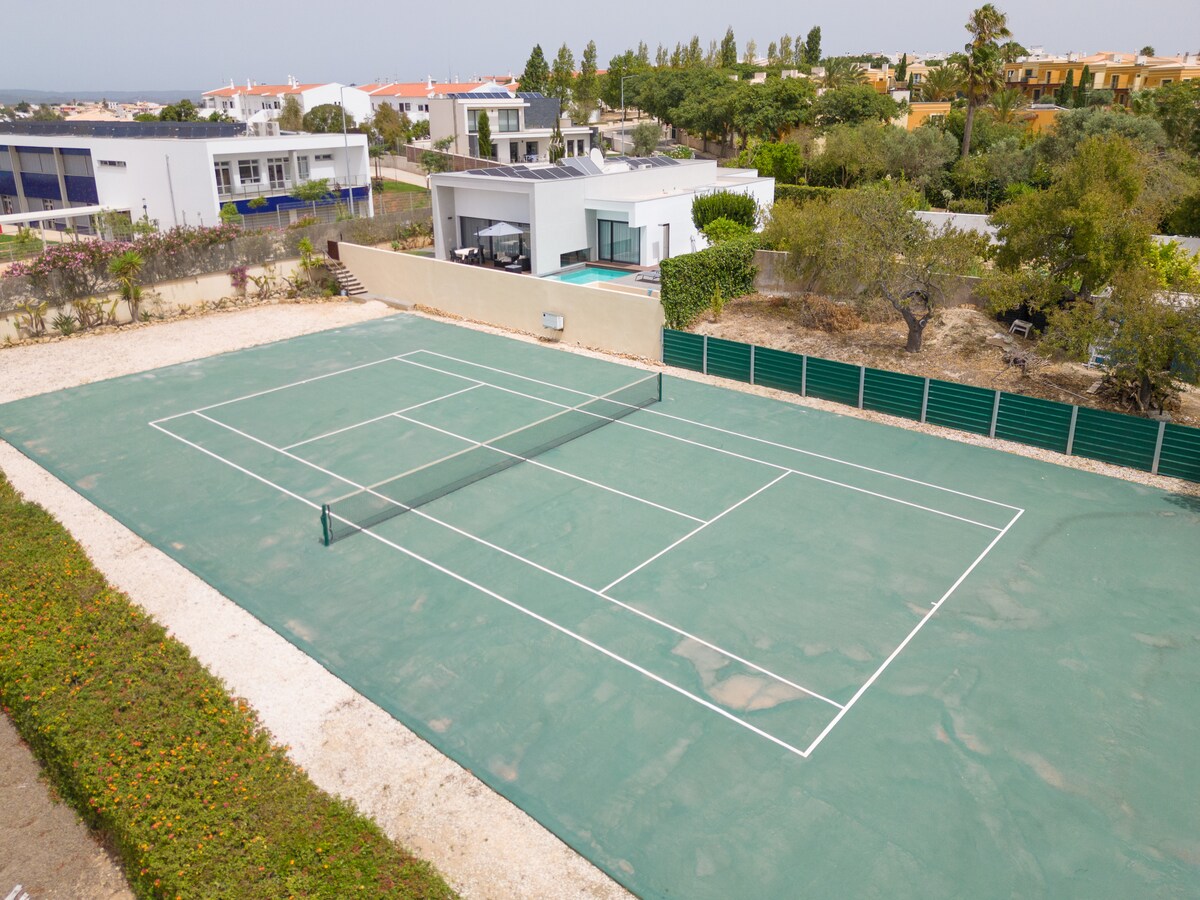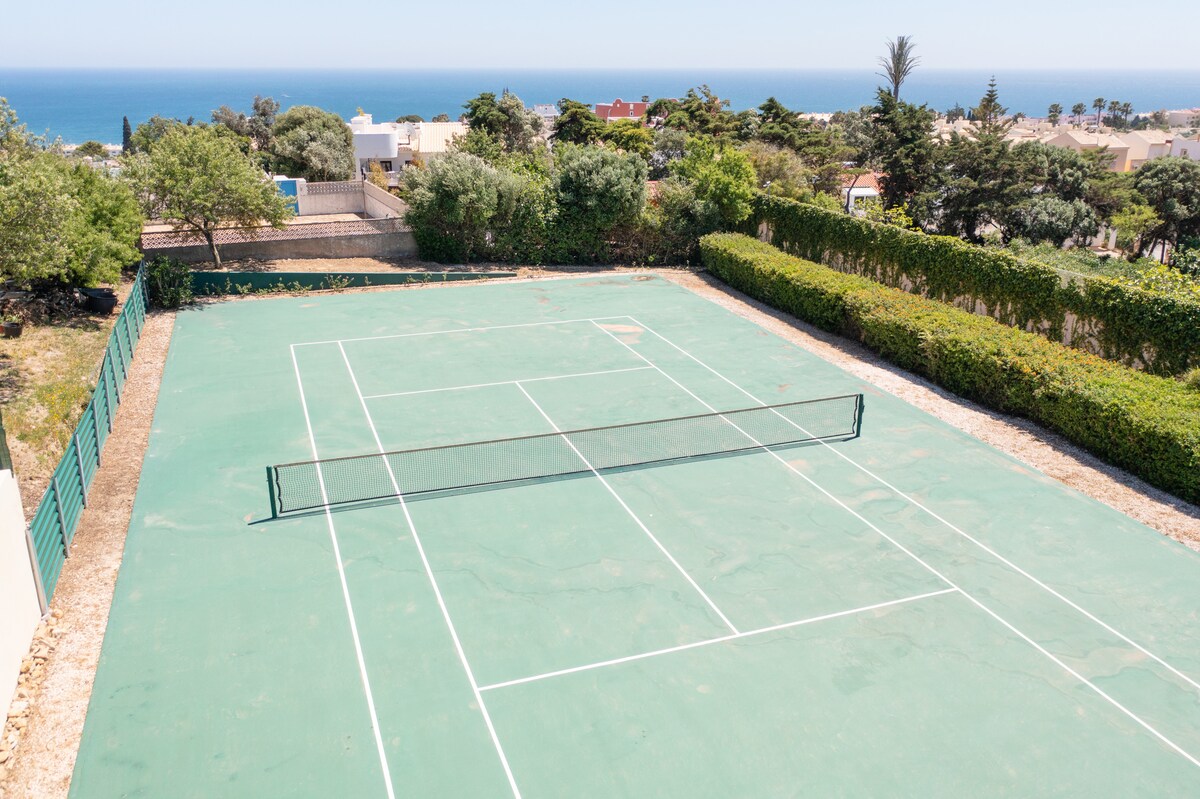 For outdoor enjoyment, the villa features a private garden with a terrace and barbecue area, perfect for al fresco dining and relaxation. In addition to access to a fully private tennis court, the property also has a private swimming pool, where families can cool off and enjoy the sunny Algarve weather.