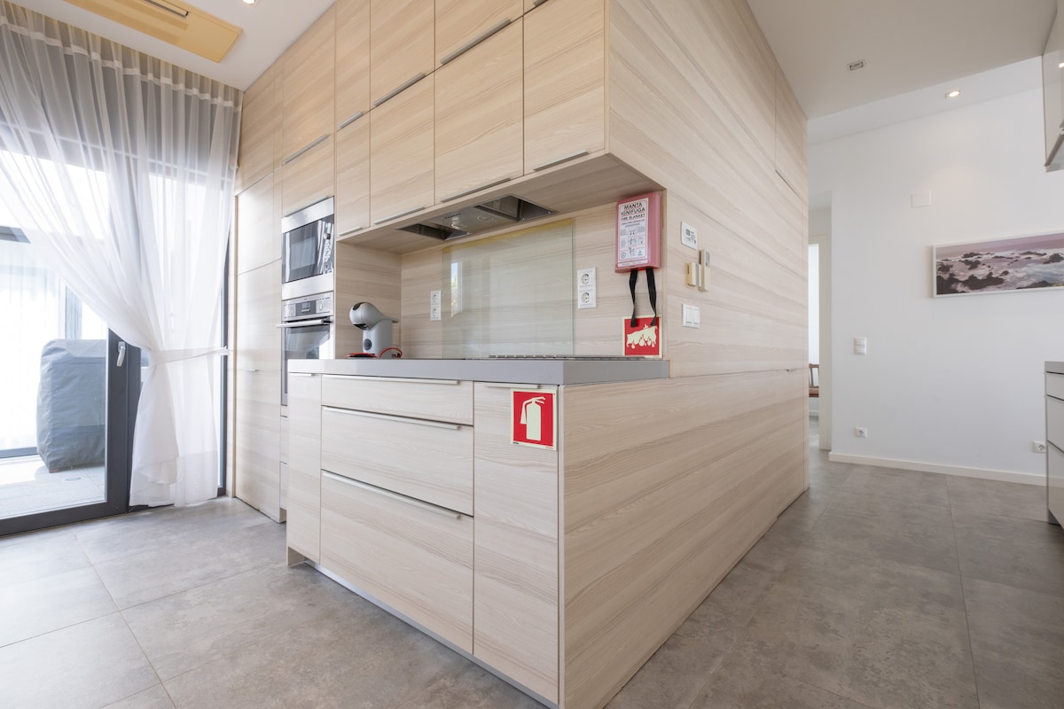 The kitchen is fully equipped with all the necessary appliances and utensils, including a fridge, freezer, oven, microwave, dishwasher, and coffee machine. Families can enjoy preparing meals together and dining in the dedicated dining area.