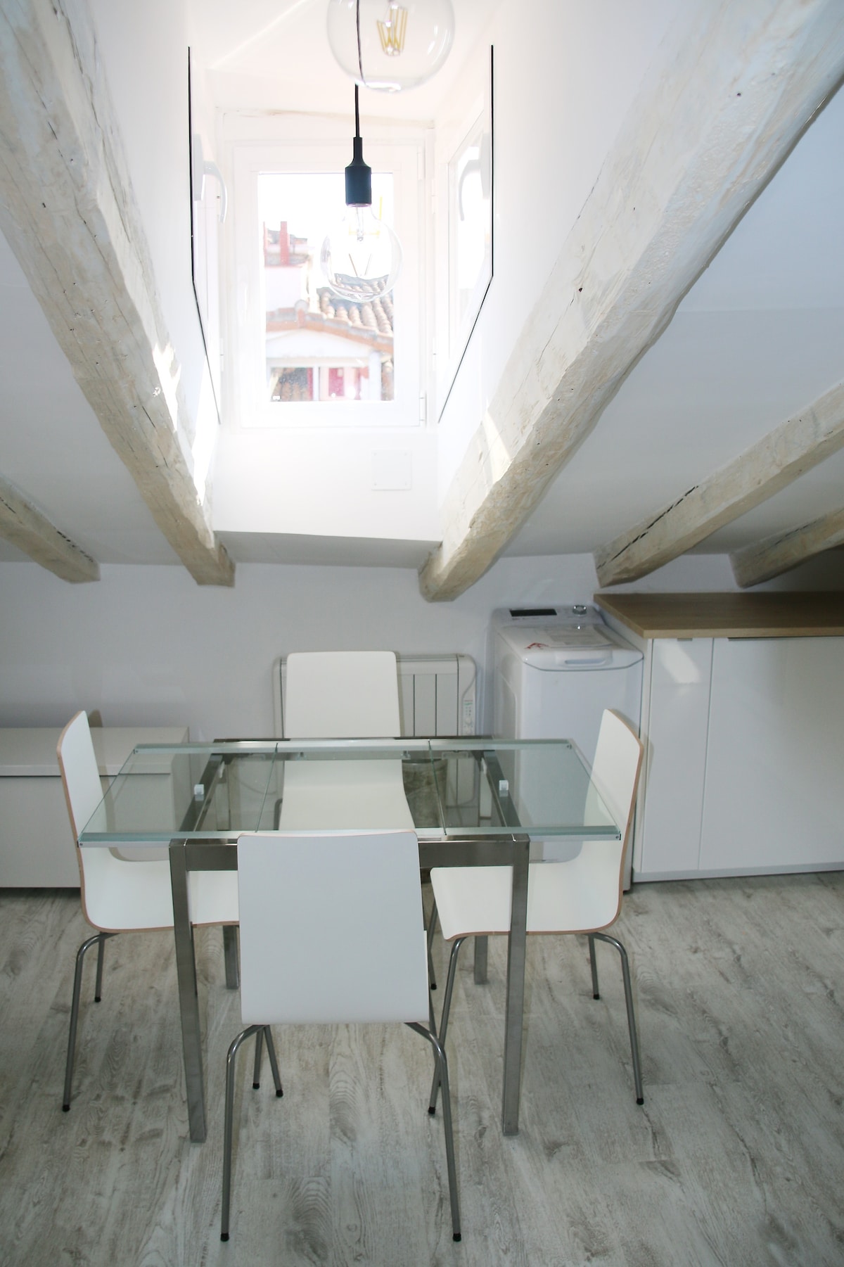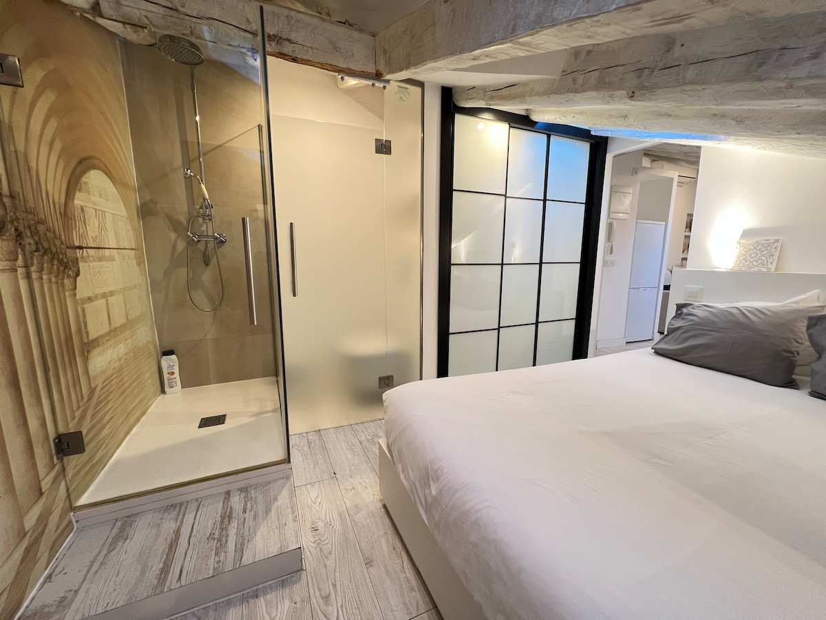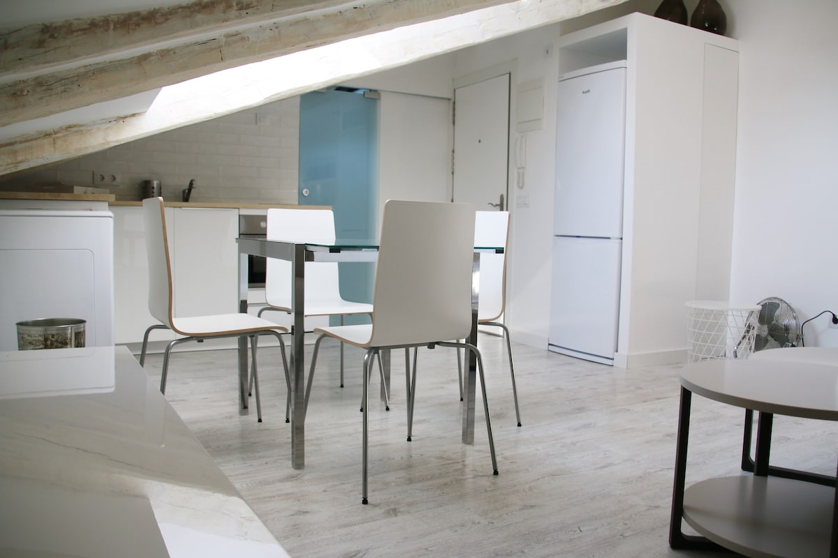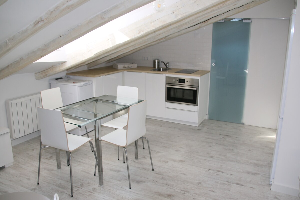 An attic apartment really very quiet for Madrid city center, can be reached in the back of the house via hallways. I felt very comfortable there (traveling alone), it is bright (several skylights and a hood), furnished with a lot of taste and excellently equipped. The washbasin, the spacious shower and the toilet (separated by a glass door) are housed in the bedroom. The height in the apartment could be a bit difficult if you are tall and want to cook often.