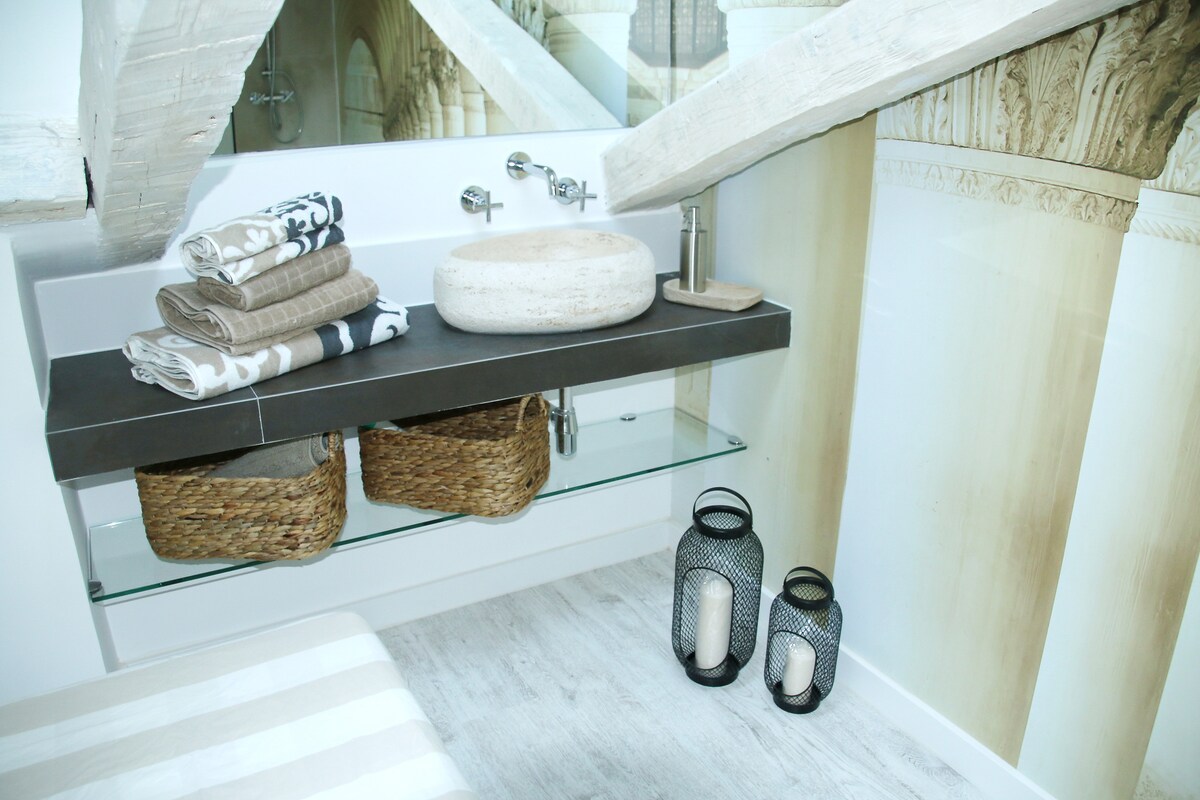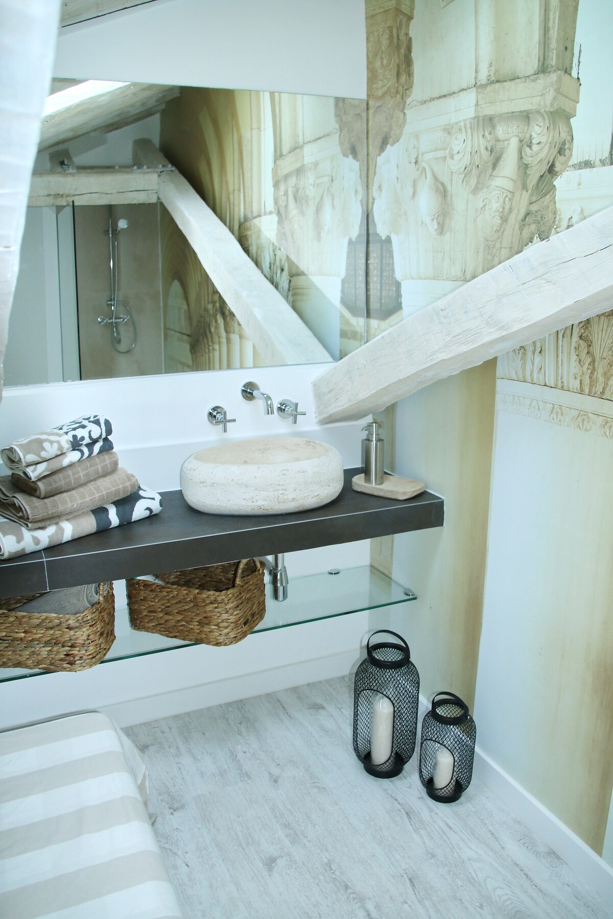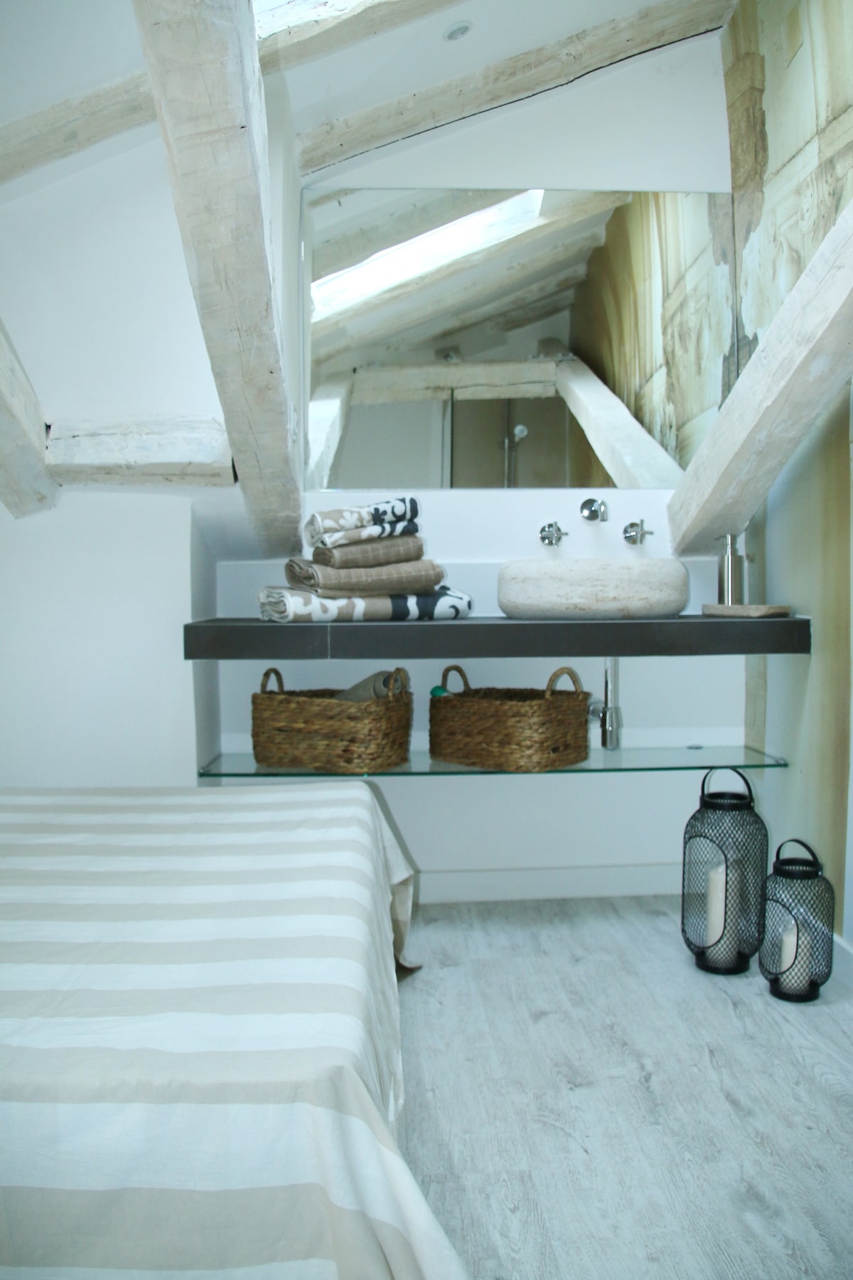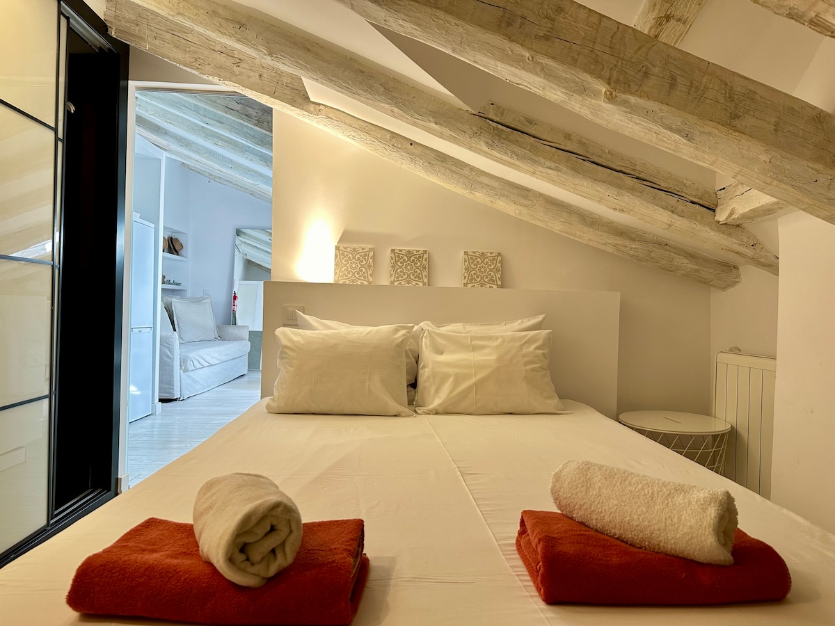 An attic apartment really very quiet for Madrid city center, can be reached in the back of the house via hallways. I felt very comfortable there (traveling alone), it is bright (several skylights and a hood), furnished with a lot of taste and excellently equipped. The washbasin, the spacious shower and the toilet (separated by a glass door) are housed in the bedroom. The height in the apartment could be a bit difficult if you are tall and want to cook often.