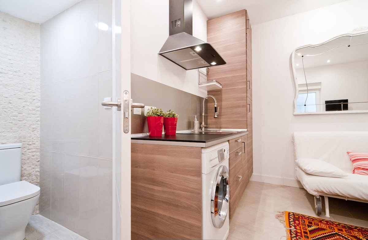 Marta's apartment is exactly as adorable and cozy as it looks in the very accurate photos. It has an immaculate and well-designed bathroom, with a generously deep shower, good water pressure, and a radiator which you will appreciate if visiting in chilly weather. It also has a separate WC, which is nice if you are two in the apartment. The little kitchen has almost everything you could possibly need to make breakfast, a snack or a meal, and a table for two at which to enjoy it. It's on a quiet little street with a lovely vista and could not be more perfectly located: you are a short walk to/from Atocha train station, and all key museums. The building itself is not much, and you enter down a narrow, rather dim courtyard lined with clotheslines, but that just makes opening the door onto this little jewel box even more of a treat! There are also no stairs if that is a consideration. Oh! And the most comfortable bed of anywhere I stayed in 3 weeks traveling around Spain. Perfect for one, romantic for two. Enjoy.