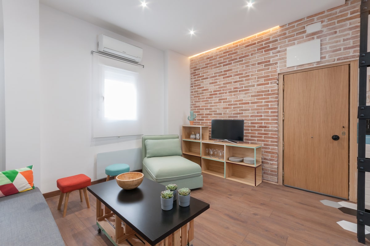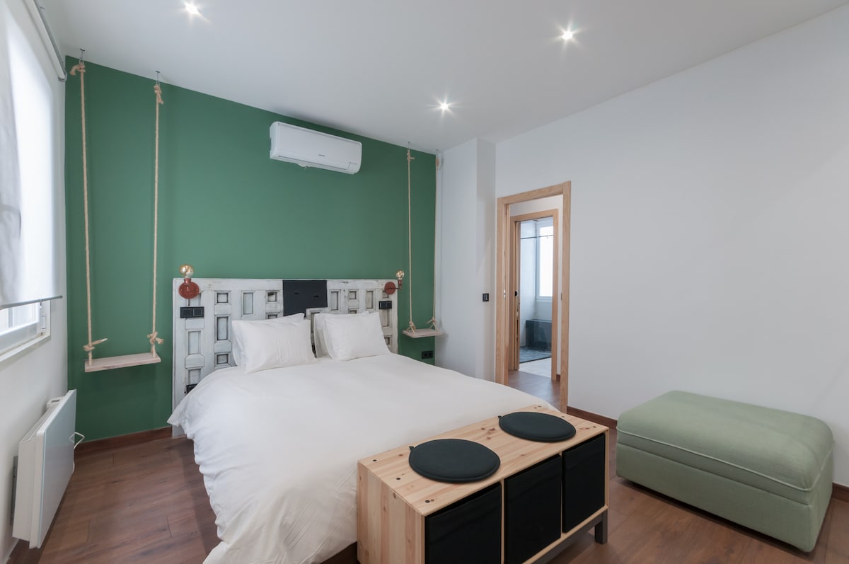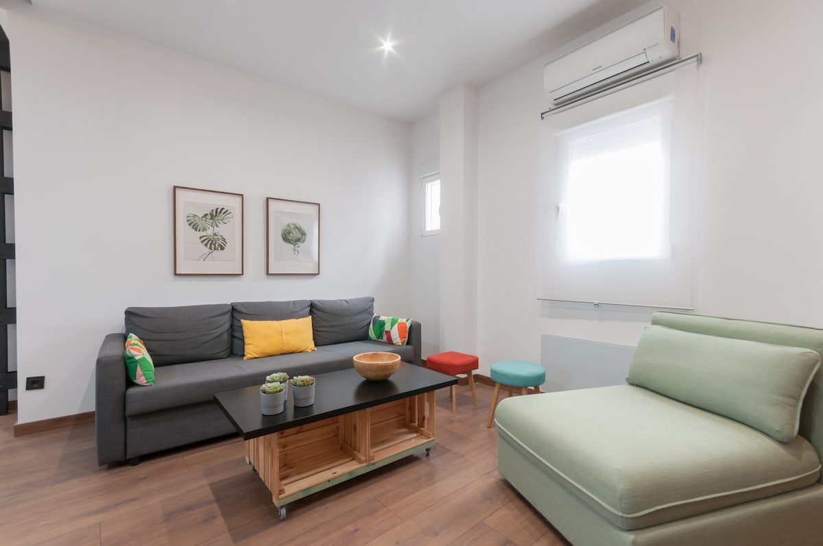 Air conditioning in the living room and WIFI to enjoy Madrid. Beautiful apartment completely new, Fully equiped. 65 squared meters of good taste.Two bedrooms with double bed, One bathroom and kitchen.